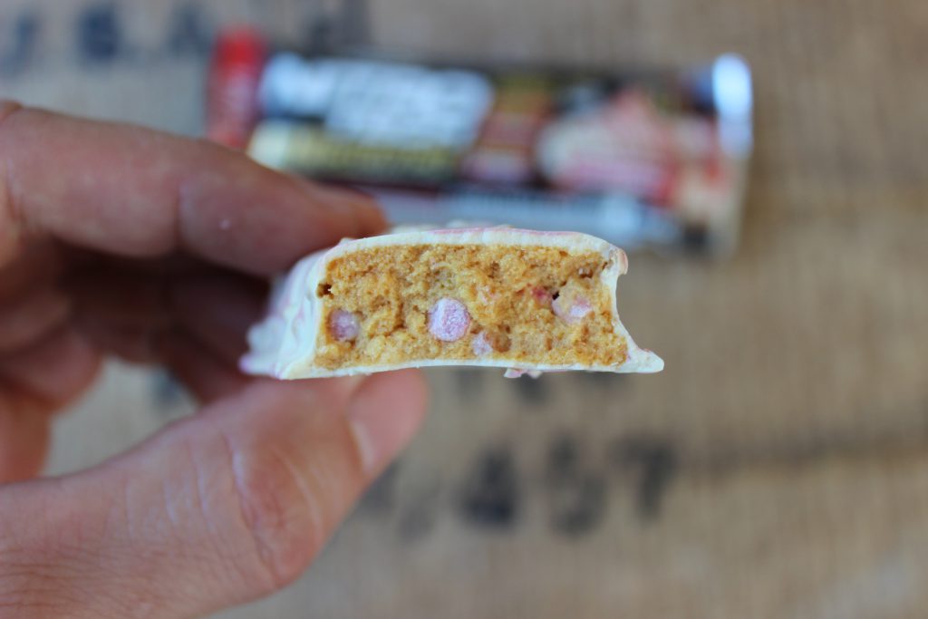 Betrachtet man den „Mantel“ der Nitrotech Crunch Proteinbar, fallen einem besonders die pinken Erdbeer-Verschnörkelungen auf. Die Oberfläche der Cheesecake-„Übergusses“ fällt insgesamt „rillig“ und „uneben“ aus. Wenn man in den Riegel beißt, kommt es zu einer wahren Geschmacksexplosion gepaart mit süßen, knusprigen „Überraschungen“. Der Erdbeergeschmack kommt zwar etwas künstlich rüber, hält sich allerdings dezent im Hintergrund auf. Was den Cheesecake-Geschmack angeht, könnte man diesen im ersten Moment auch für „Birthday Cake“ halten. Ziemlich süß und mit einem Ticken zu viel Vanille. Somit hätte die Bezeichnung „Strawberry Birthday“ in dem Fall wohl besser gepasst. Nichtsdestotrotz verdammt lecker!