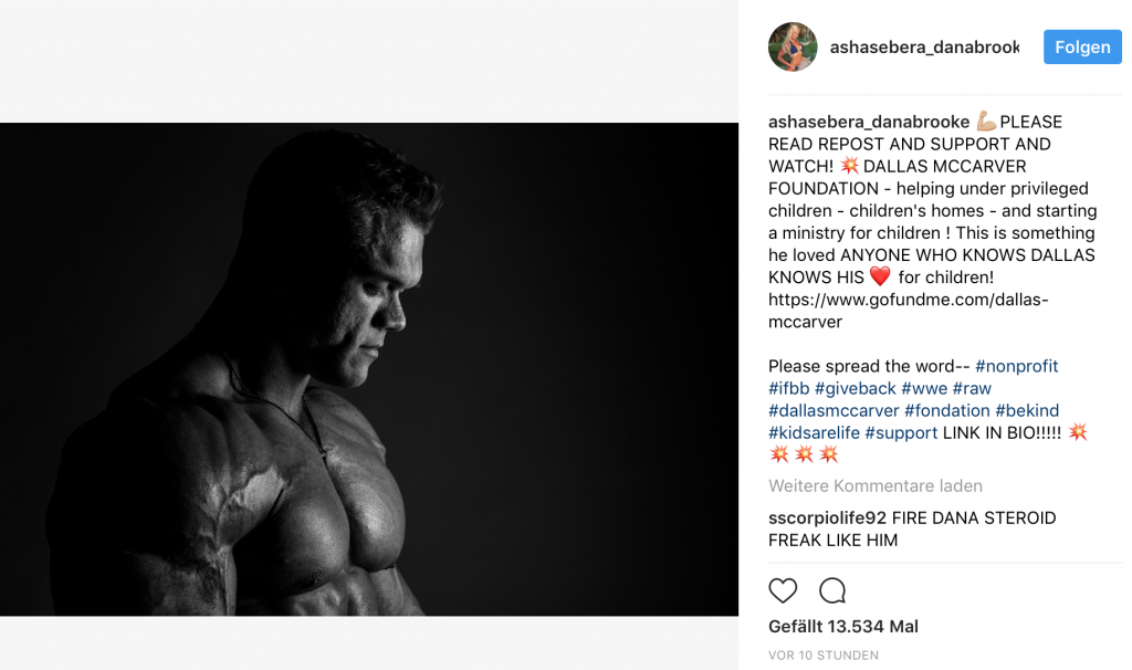 Dana Brooke war bereits seit Längerem mit Dallas liiert und bezeichnete sich stets als seine bessere Hälfte. Auf Instagram nahm sie gestern in einem rührenden Post Abschied von ihrem geliebten Freund und kündigte gleichzeitig eine Non-Profit-Aktion zu Ehren von McCarver an. Kurze Zeit später folgte dann ein weiterer Post, in der die WWE-Wrestlerin zu Spenden für die von ihr ins Leben gerufene „Dallas McCarver Foundation“ aufrief.