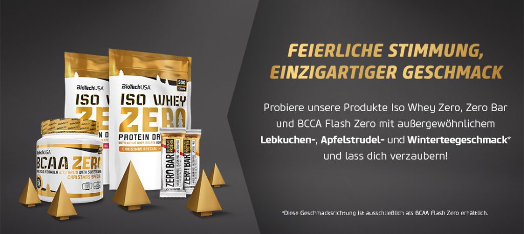 Die Sonderedition des beliebten Whey Protein Isolats von BioTech hat schon im letzten Winter einen wahren Hype erlebt. Viele schwören schon bei den herkömmlichen Sorten von dem einzigartigen Geschmack des Proteinpulvers. Schließlich soll das Eiweißpulver nicht nur ausgezeichnet schmecken, es hat pro Messlöffel auch noch kaum Kohlenhydrate und Fett. Die Wintersorten sollen aber wohl noch besser gewesen sein. Genau aus diesem Grund gibt es die beiden Flavour „Apfelstrudel“ und „Lebkuchen“ auch 2017 wieder während der Weihnachtszeit. Doch nicht nur das, BioTech hat die beiden Sorten auch noch für die neuen Zero Bar Proteinriegel entwickelt!
