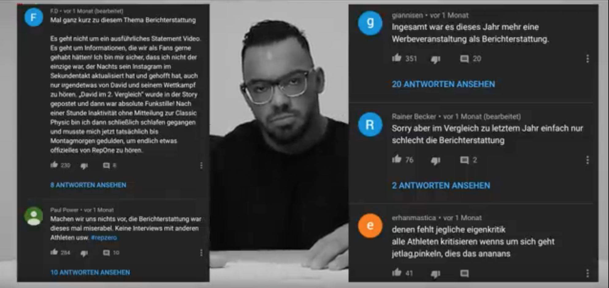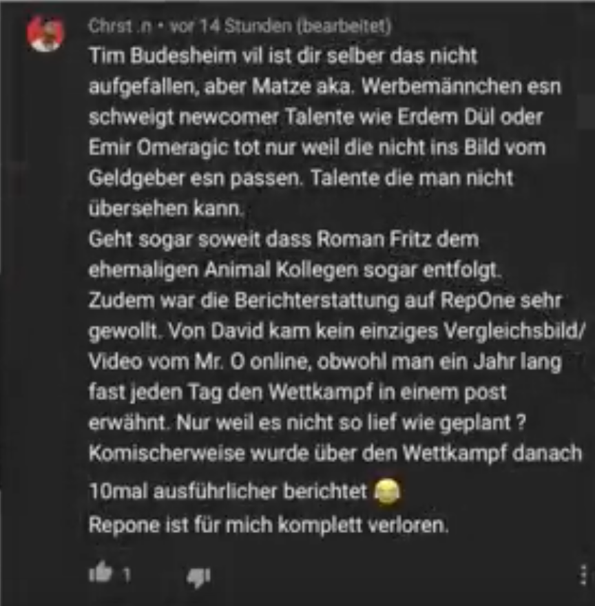 Diese Selektion der Berichterstattung ist auch einigen (ehemaligen) RepOne Fans aufgefallen. Besonders offensichtlich war hier auch, dass man David Hoffmann’s Olympia Teilnahme enorm gepusht hat und dann kein Wort über das eher ernüchternde Ergebnis verloren hat. Die Fans ärgert das natürlich: