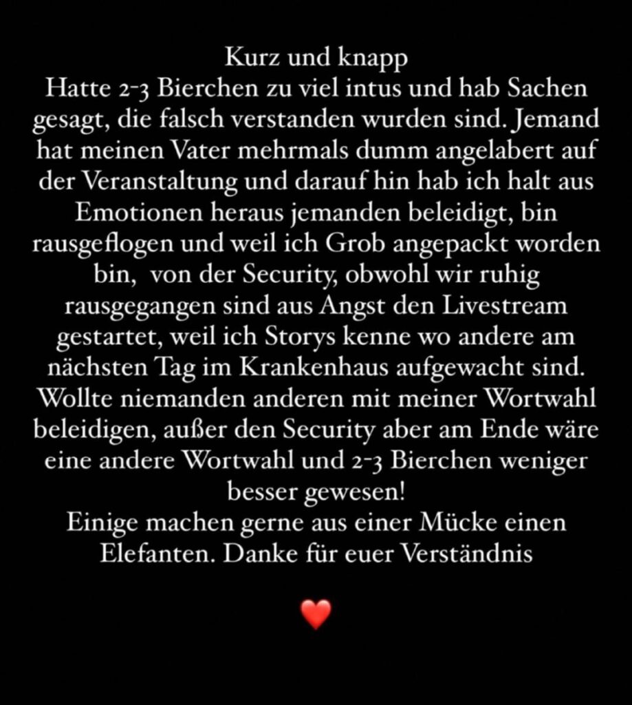 „Wir müssen uns mit so Geringverdienern nicht abgeben! Was verdienst du denn im Monat? 1500 Euro? […] Die pisse ich raus, Alter! Du Geringverdiener!“ war eine der getätigten Aussagen. Darauf folgten außerdem noch weitere Gewaltandrohungen und Pöbeleien, wie man sie aus dem Mund eines Alkoholikers erwarten kann. Die im Livestream festgehaltene Szene ist nachfolgend verlinkt.