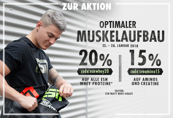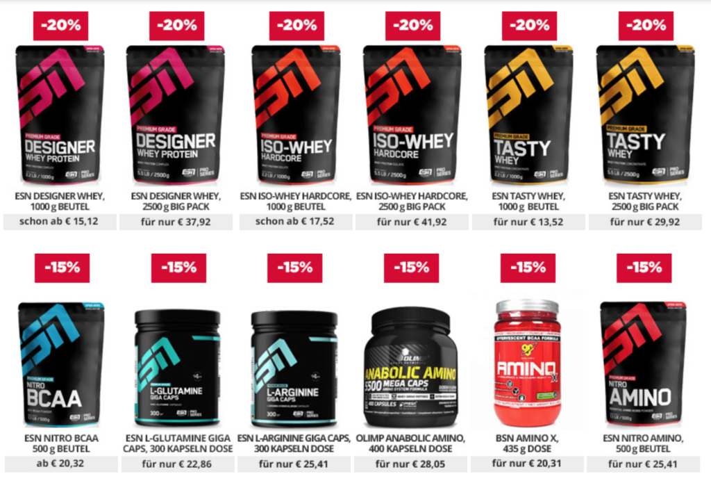 Den meisten Profit kannst Du bei den Proteinpulver-Produkten von ESN machen. Dafür sparst Du bei allen Creatin- und Amino-Supplements nicht nur bei der Hausmarke von Fitmart, sondern bei ALLEN Herstellern im Shop!