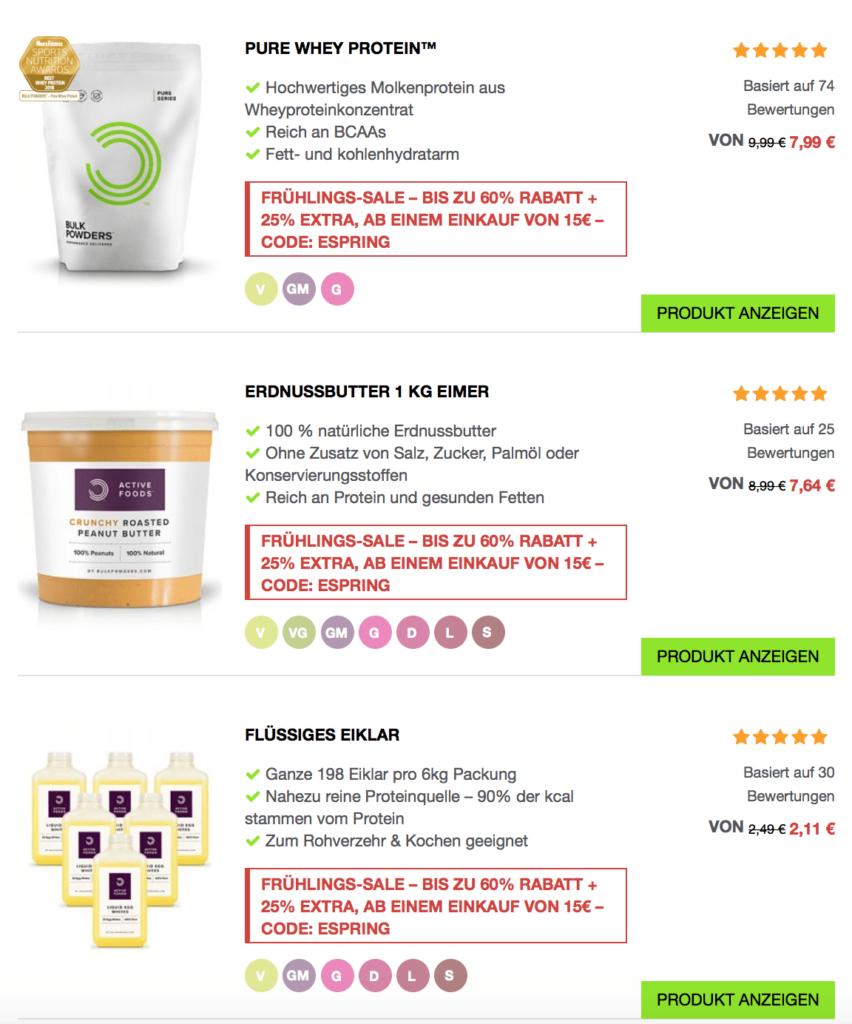 Diesmal ist sogar das Lieblingsprodukt, das flüssige Eiklar, von dem Angebot betroffen. Außerdem gibt es auch noch Nussbutter, Proteinpulver und vieles mehr zum Spezialpreis: