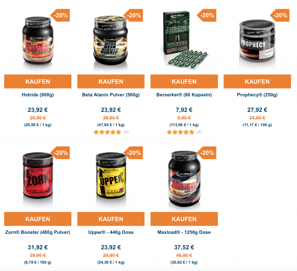 Der deutsche Supplement Hersteller IronMaxx widmet diese Woche ganz dem Thema Trainingsbooster. Dafür gibt es bis Sonntag einen Spezialsale und damit alle beliebten Booster zum Sonderpreis. Auf UPPER, ZORN, BERSERKER und viele mehr könnt ihr euch somit 20 Prozent Rabatt sichern: