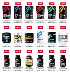 Doch natürlich gibt es auch einige Supplements zum Vorzugspreis. So kannst Du Dir beispielsweise alle ESN Proteine 20 Prozent günstiger in den Warenkorb packen und auch Booster Fans kommen auf ihre Kosten!