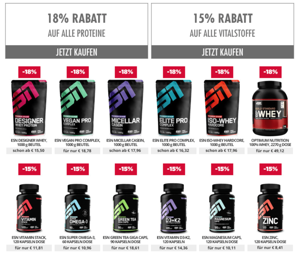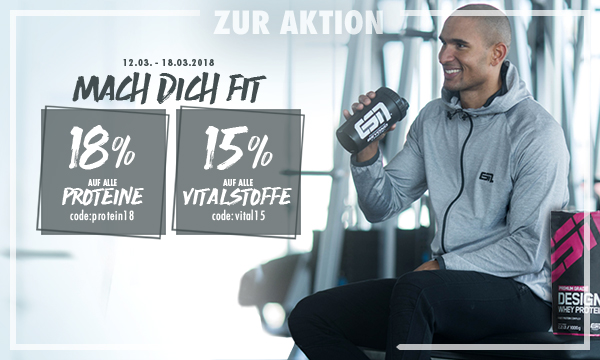 Bis Sonntag kannst Du 18 Prozent auf alle Eiweiße von sämtlichen Herstellern sparen. Zusätzlich gibt es auch noch 15 Prozent Nachlass auf alle Vitalstoffe. Auch hier hast Du die freie Auswahl unter allen Marken!
