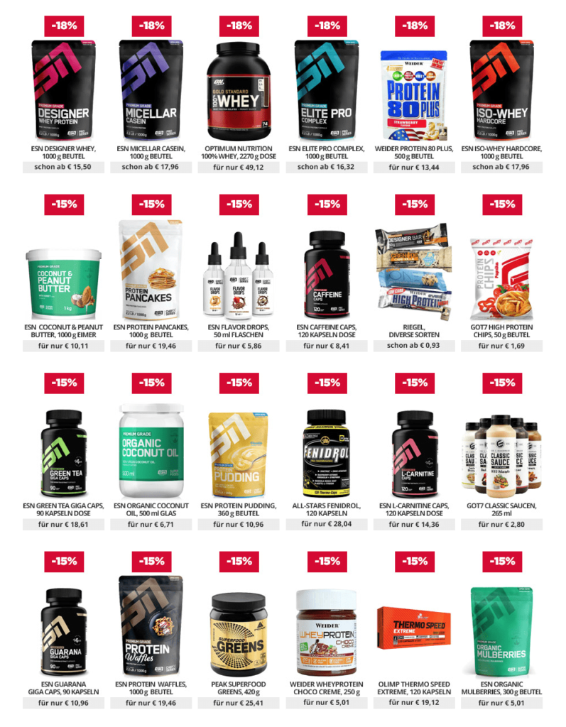 Wenn Du Dich also nicht nur mit der Hausmarke von FITMART eindecken möchtest, sondern auch Bestseller, wie das Gold Standard Whey von Optimum Nutrition oder das ISO100 Whey Protein Isolat von Dymatize ausprobieren möchtest, ist genau jetzt der richtige Zeitpunkt! Zudem gibt es Lieblinge, wie ESN’s Coconut & Peanut Butter, den Carb Killa Riegel von GRENADE, Protein Chips und vieles mehr 15 Prozent günstiger!