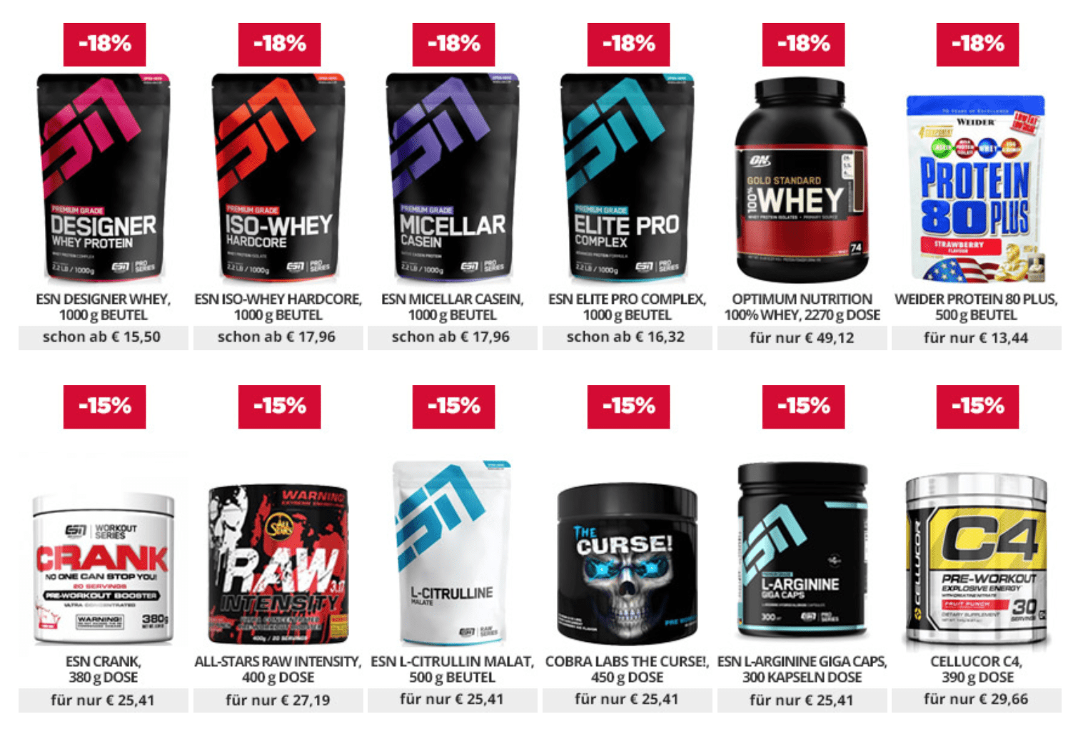 Die Rabattaktion gilt übrigens für ALLE Marken, nicht nur die Eigenmarke ESN! Dementsprechend kannst Du Dir auch Bestseller, wie das Gold Standard Whey von Optimum Nutrition, das Protein80 von Weider oder den Booster C4 von Cellucor sichern: