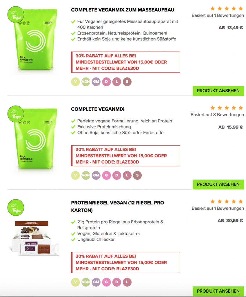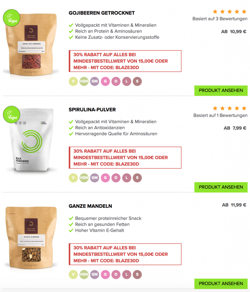 Da der November ganz unter dem Motto „vegane Produkte“ steht, hat der britische Online Shop BULK POWDERS ein ganz besonderes Special für seine Kunden. Während des „World Vegan Month“ November gibt es satte 35 Prozent Nachlass auf alle Produkte, die für Veganer in Frage kommen! Das schließt nich nur typische Supplements wie Reisprotein, pflanzliche Proteinriegel und co. ein, sondern auch Superfoods wie Goji Beeren, Chiasamen und vieles mehr:
