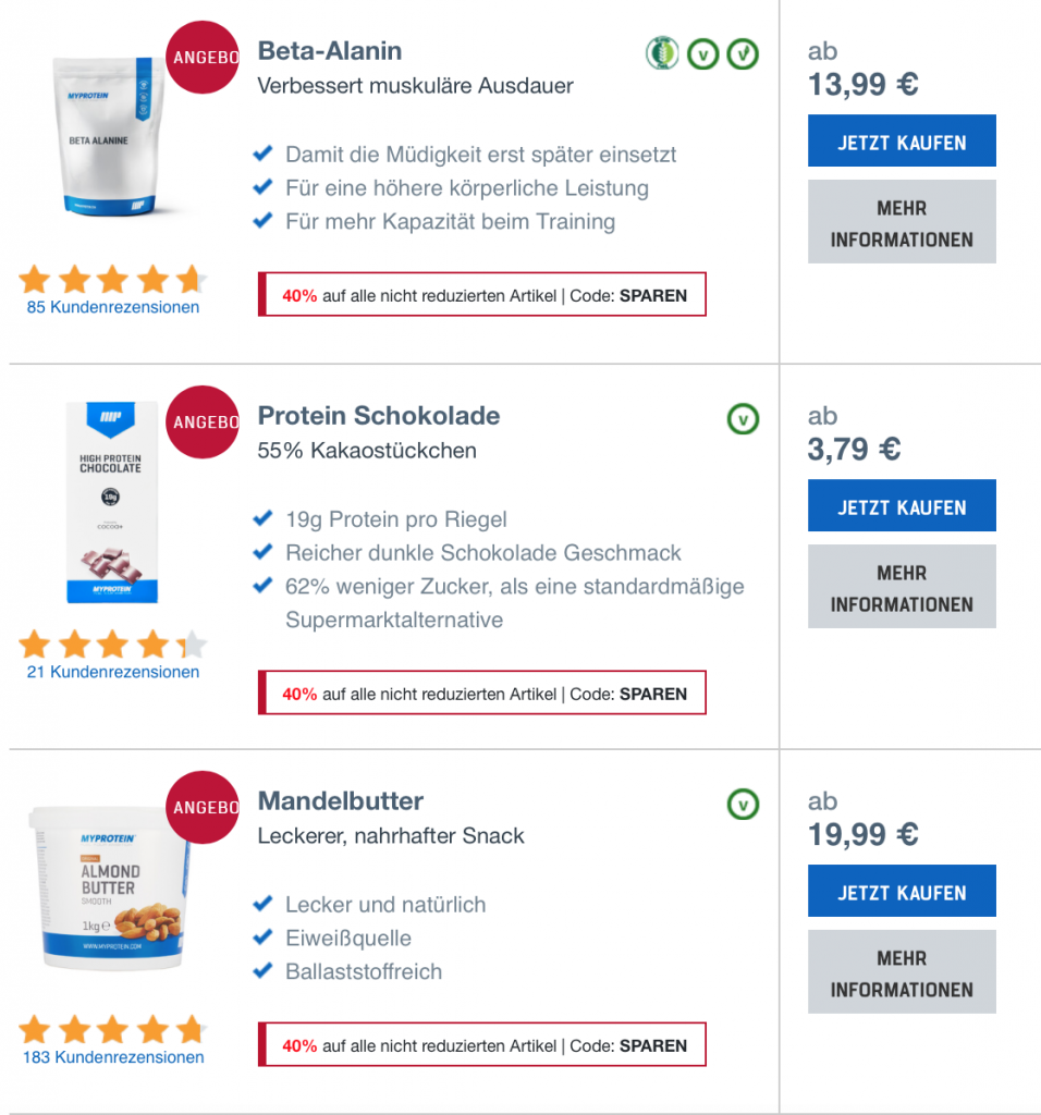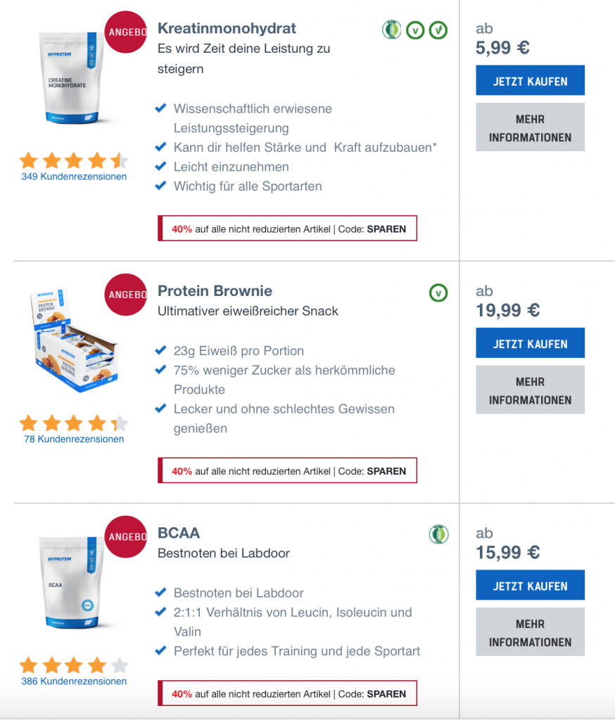 Der Supplement Discounter MyProtein ist in der Fitnessszene bekannt dafür, immer mal wieder enorme Deals anzubieten. Eigentlich sind schon die Normalpreise des Shops aus England beinahe unschlagbar. Doch ab und an lockt die Marke dann auch noch mit zusätzlichen Rabattaktionen. Aktuell schenkt MyProtein seinen Kunden wieder bares Geld: insgesamt 40% Rabatt können sich Kunden nun auf alle Artikel sichern, die nicht bereits reduziert sind. Das schließt damit vor allem Produktneuheiten und Bestseller mit ein: