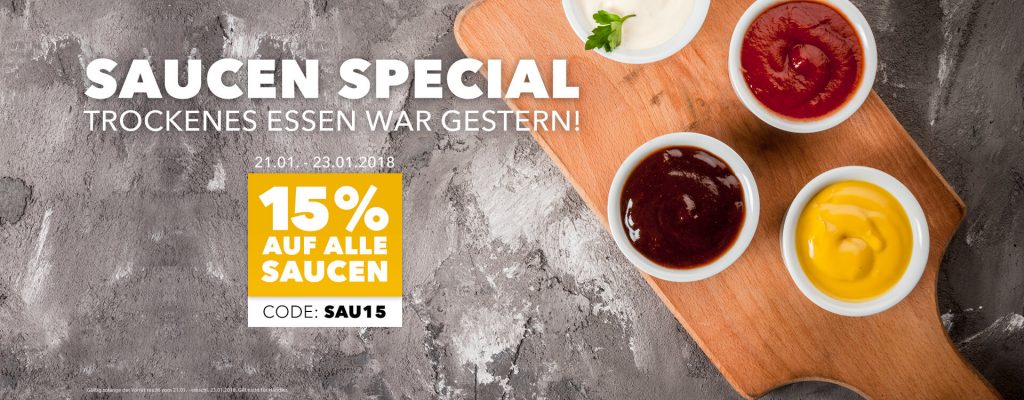 Im Muskelmacher Shop gibt es deshalb nun das ideale Angebot, das auch Dich beim Durchhalten Deiner Diät unterstützt. Bis morgen kannst Du 15 Prozent auf ALLE FITNESS SAUCEN sparen: