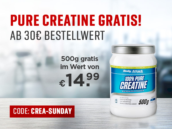 Deine Kreatin-Vorräte neigen sich dem Ende zu? Dann ist heute der ideale Zeitpunkt, um im Online Shop von Body Attack einzukaufen. Denn nur an diesem Sonntag SCHENKT der Shop allen Kunden eine 500 Gramm Dose Kreatinpulver zu jeder Bestellung ab 30 Euro!