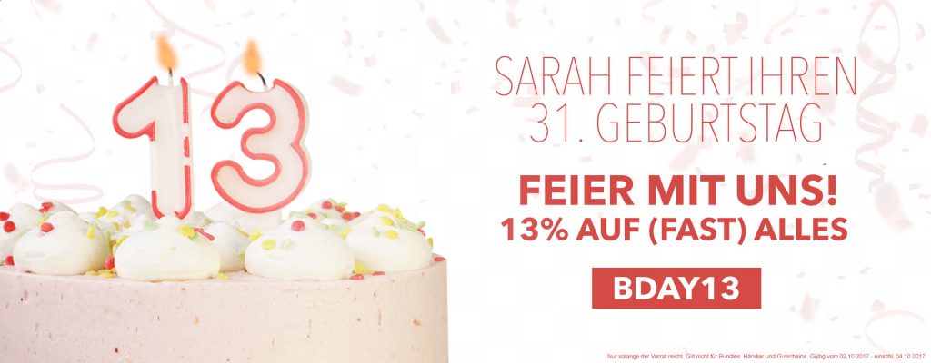 Anlässlich des 31. Geburtstags der Lady des „Muskelmachers“, Sarah, spendiert Simon Ulrich 13 Prozent Nachlass auf das Sortiment des Online Shops. Davon ausgeschlossen sind Bundles und Gutscheine. Ansonsten bekommt ihr Produkte aller Marken zu einem günstigeren Preis!