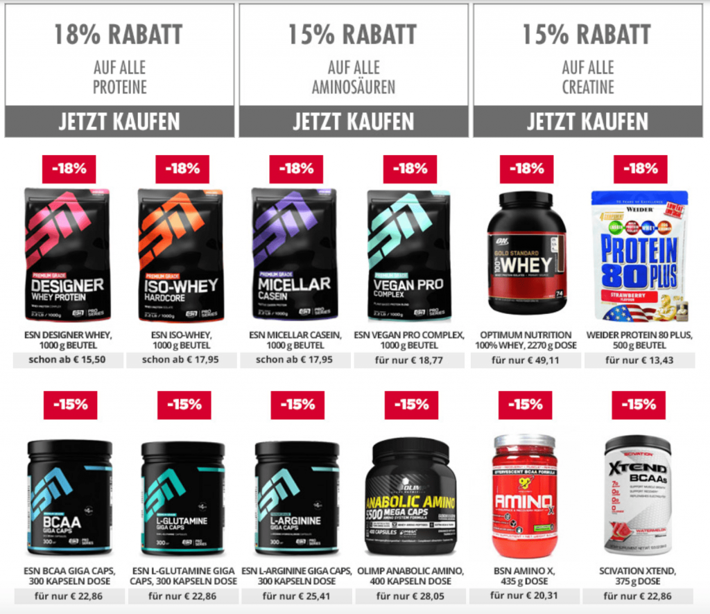 Wer sein Supplementregal auffrischen will, sollte deshalb direkt zuschlagen. Diesmal gelten die Gutscheincodes nämlich nicht nur für die Hausmarke ESN, sondern für ALLE MARKEN im FITMART Shop! Dementsprechend lohnt sich der Einkauf noch mehr. So viel könnt ihr sparen: