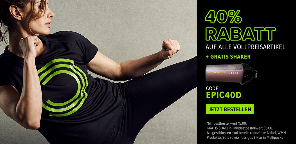 Der englische Supplement Shop Bulk Powders geht aktuell in die letzte Runde des Neujahrs-Sale. Dafür sind alle SALE Produkte noch weiter reduziert. Doch nicht nur das: auch alle nicht reduzierten Supplements bekommst Du mit dem Gutscheincode „EPIC40D“ ganze 40 Prozent günstiger! Zusätzlich schenkt Dir Bulk Powders auch noch einen kostenlosen Shaker mit dem Motto „#dominatelife“ mit dazu: