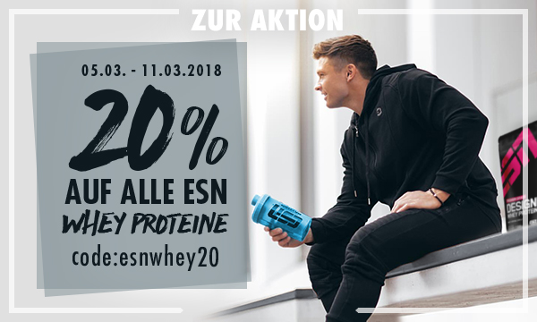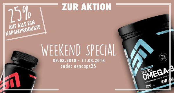 Diese Aktion ist auch mit der Wochenaktion kombinierbar. So kannst Du also nicht nur auf Kapselprodukte, sondern auch auf alle ESN Whey Proteine sparen!
