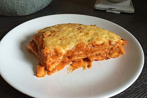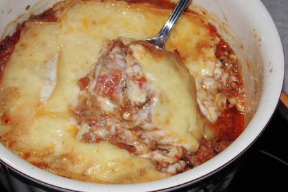 Nun die Eimasse in Scheiben schneiden, die der genutzten Auflaufform entsprechen. Jetzt abwechselnd, beginnend mit der Hackfleischsauce, Sauce Bechamel und Lasagneplatten in der Auflaufform stapeln. Die letzte Schicht sollte die Bechamel sein, welche dann mit Käse überstreut wird.