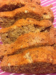 Eine Kastenform mit dem Kokosöl einfetten, dann den Teig einfüllen. 75 – 80 min.backen.