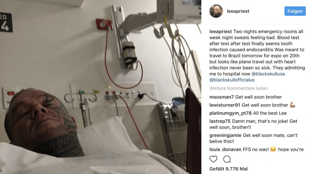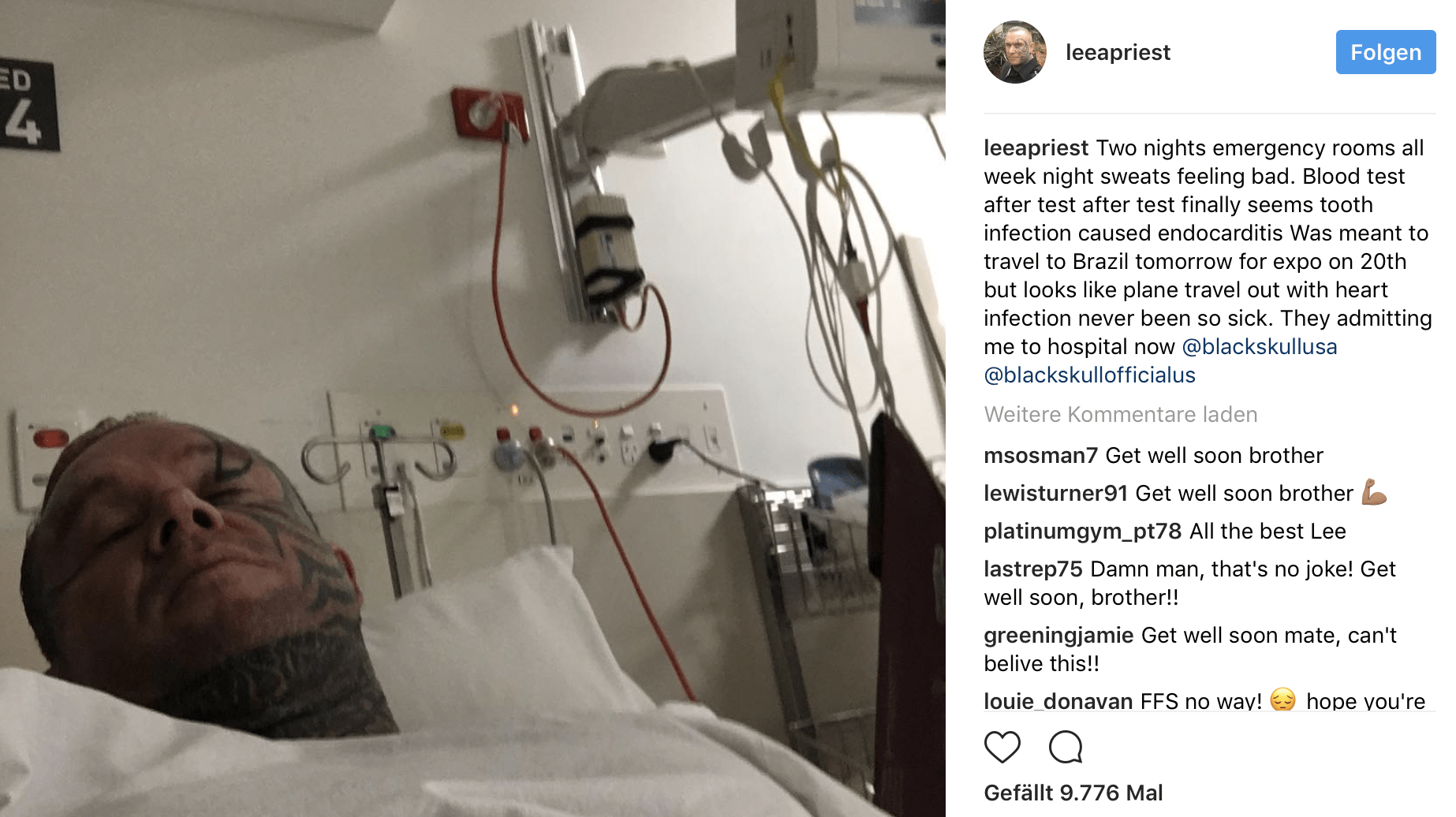 Via Instagram teilte Lee Priest seinen Fans mit, dass er sich bereits seit zwei Tagen in der Notaufnahme befinde, nachdem er die Woche zuvor jede Nacht mit Schweißausbrüchen und extremen Unwohlsein zu kämpfen hatte. Zahlreichen Bluttests hätten irgendwann schließlich ergeben, dass eine Zahninfektion bei ihm eine Endocarditis (Entzündung der Herzinnenhaut) verursacht hätte, schreibt der Australier weiter.