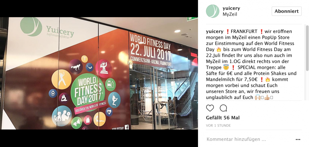 Wir sind gespannt, wie die Frankfurter das Angebot der YUICERY annehmen. Vielleicht gibt es nach dem World Fitness Day ja auch einen beständigen Store in der MyZeil.