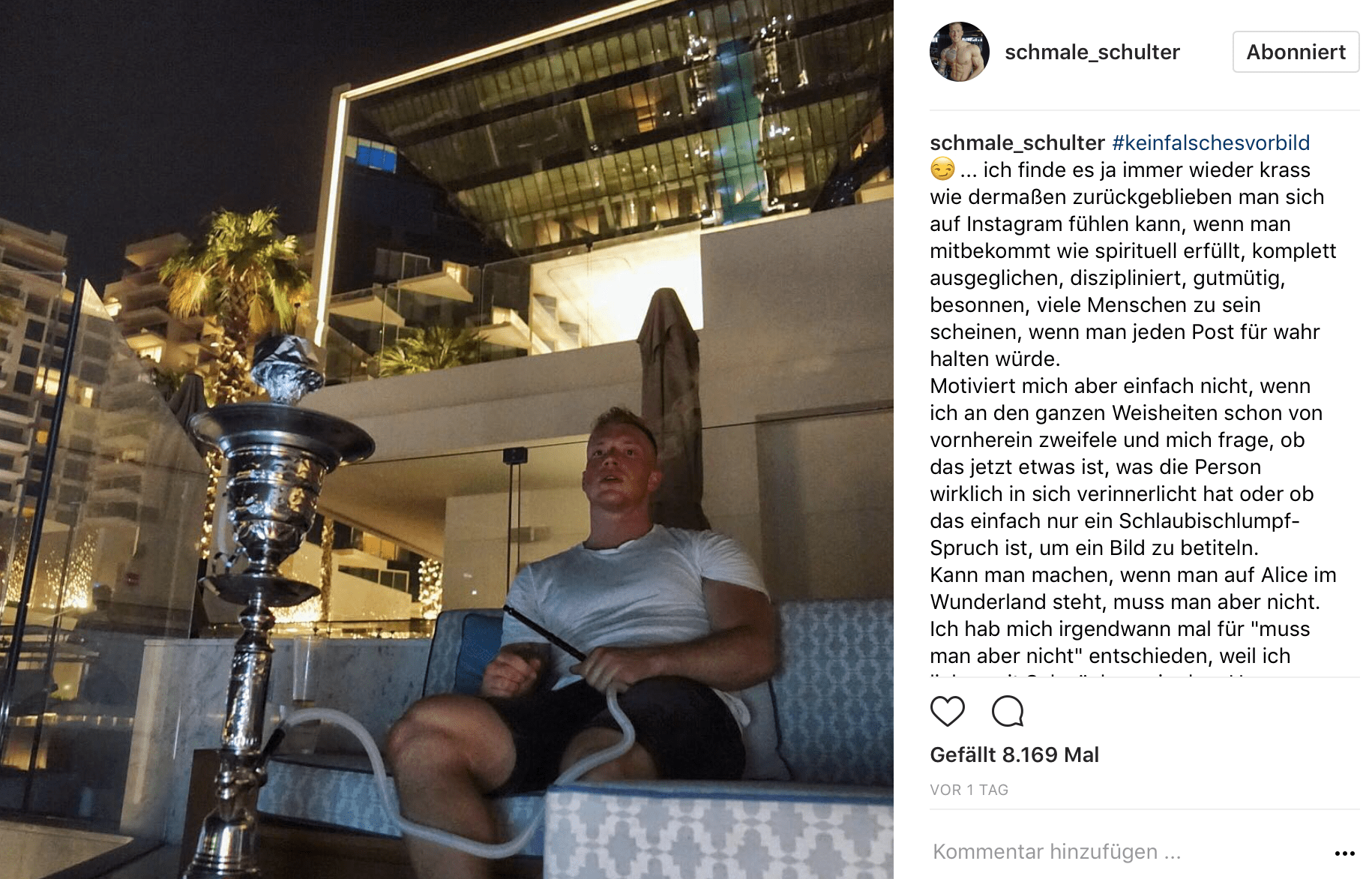 Erstaunlich lange ist die Beschreibung unter einem der aktuellen Instagramposts von Schmale Schulter. Der Anlass dafür war wohl eine gewisse Selbstreflexion, die der Rocka Nutrition Athlet in seinem Urlaub getätigt hat. Nach eigenen Aussagen fühlt sich Kay im Vergleich zu anderen Fitness Influencern in den Sozialen Netzwerken nämlich in gewisser Weise „zurückgeblieben“. Schließlich könne er nicht mit schlauen, spirituellen Sprüchen und Weisheiten dienen. Ganz im Gegenteil zeigt er ja sogar Fast Food, Shisha und andere menschliche „Laster“, die von der Fitnessszene nicht allzu gerne gesehen werden. Doch stören tut das Kay scheinbar ganz und gar nicht. Viel mehr nutzt er diesen Unterschied dazu, sich selbst von der „Seifenblase der perfekten Vorbilder“ abzugrenzen. Wie er klar sagt, glaubt Schmale Schulter nicht, dass all die motivierenden, tiefgründigen Gedanken wirklich das Ergebnis besonnener und ausgeglichener Persönlichkeiten sind. In den Augen des Polizisten ist das alles lediglich eine Illusion und hat nicht mit der Wirklichkeit zu tun.