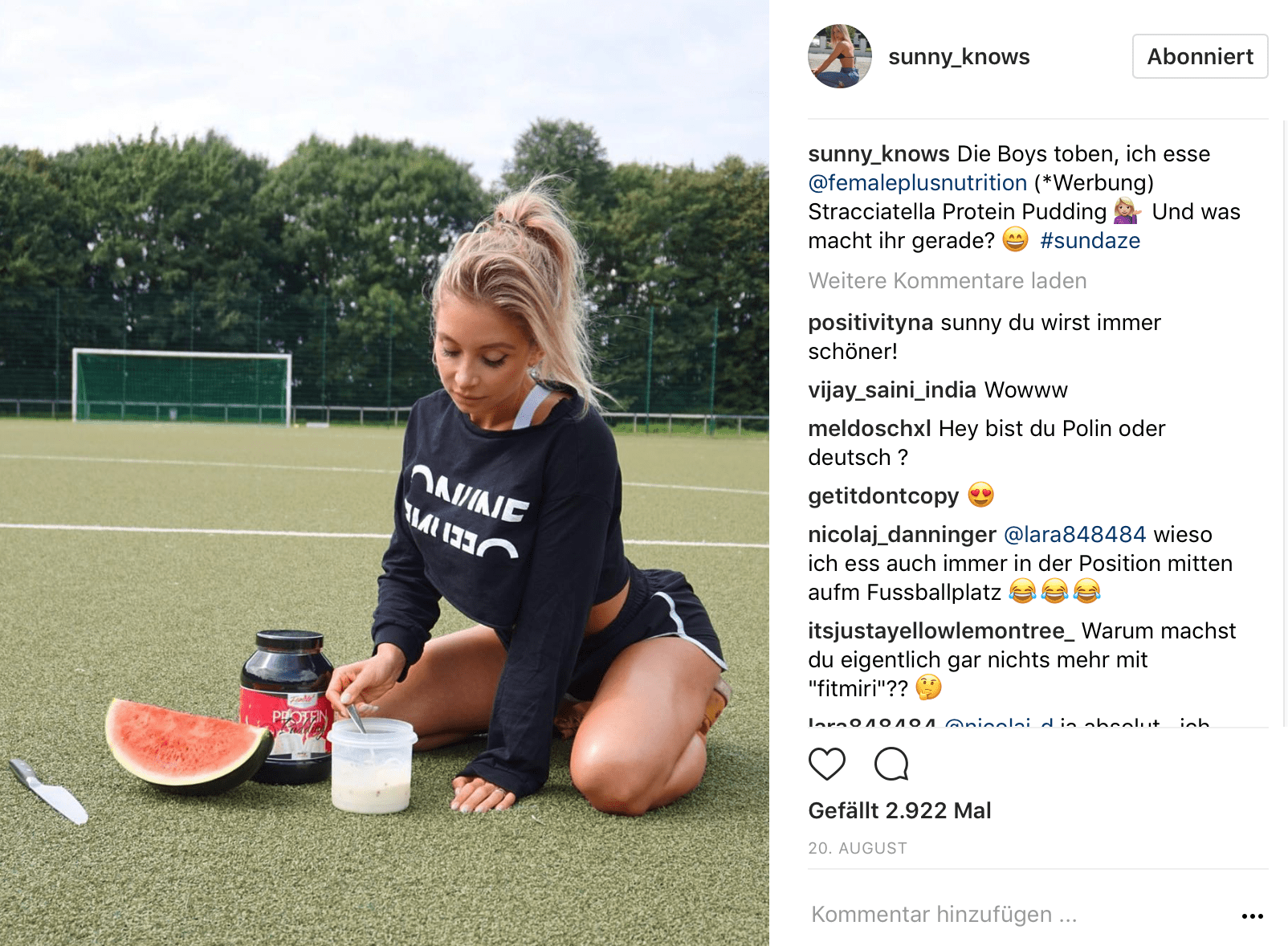 Wer kennt diese Situation nicht: man ist an einem Sonntagnachmittag gemütlich auf dem Fußballplatz und packt mitten auf dem Spielfeld erst einmal ein riesiges Stück Wassermelone mit entsprechendem Schneidemesser, einen fertig zubereiteten Proteinpudding und natürlich die passende Dose des Produkts aus. Das hat man natürlich alles mit dabei, wenn man mit Mann und Kind unterwegs ist. Genauso authentisch, wie die Utensilien für den Fußballplatz empfindet Nico hier die Pose von Sunny. In gewohnt sarkastischem Ton weist Inscope seine Zuschauer darauf hin, dass es natürlich das Normalste der Welt sei, sich auf den Boden zu knien, den Hintern durch ein extremes Hohlkreuz zu betonen und so den Pudding zu löffeln.