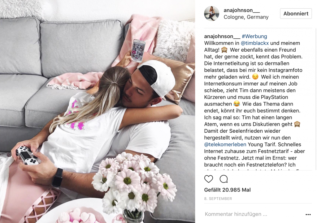 Wie bekommt man es als Influencer am unauffälligsten hin, Werbung für einen Telekommunikationsanbieter zu machen? Vor allem, wenn man sonst eher Fashion- und Beauty-Inhalte postet? Genau diesem Problem hat sich die erfolgreiche Bloggerin Ana Johnson aus Köln gestellt. Herausgekommen ist ein „unauffälliges Zufallsbild“, das die Dame mit ihrem Freund in einer absolut „natürlichen“ Pose zeigt. Gott sei dank haben die beiden ihren Telekommunikationsanbieter, damit sie parallel ihren Hobbys im Netz nachgehen können – natürlich während sie kuscheln!