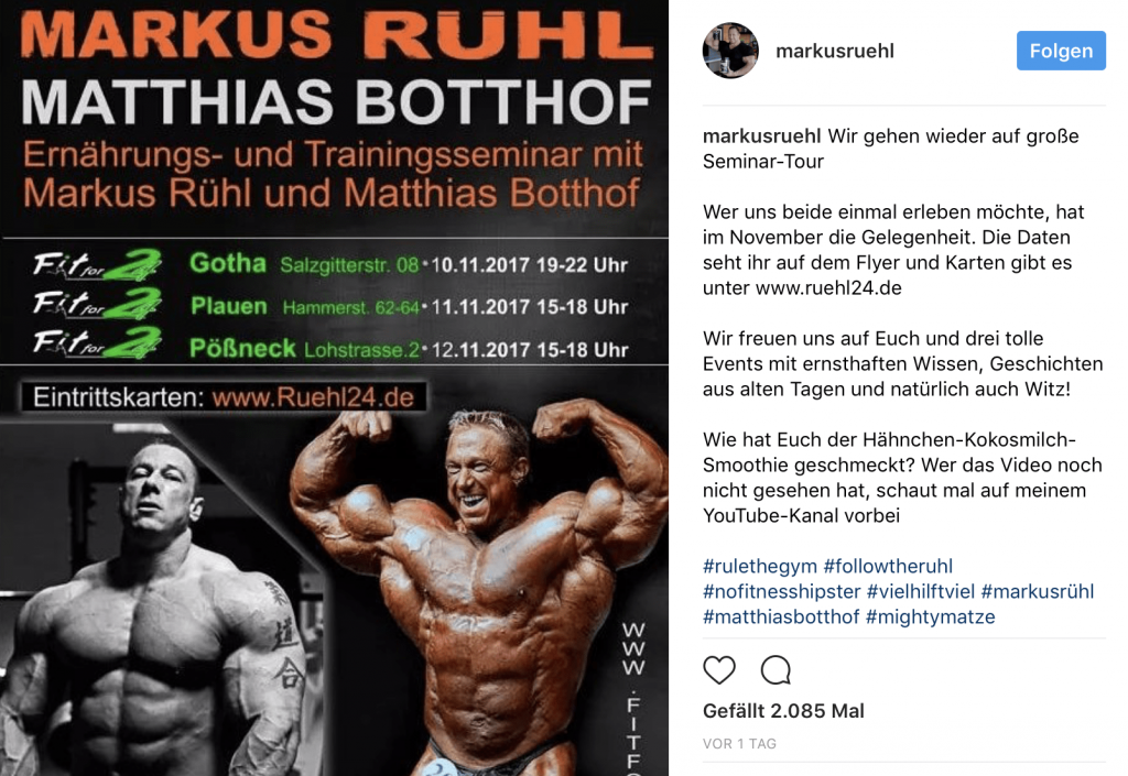 Und genau dieses Motto wollen Rühl und Botthof bei ihrer nächsten großen Seminar-Tour im November diesen Jahres fortsetzen. Gestern kündigte Markus auf Instagram an, dass „wir uns auf Euch und drei tolle Events mit ernsthaften Wissen, Geschichten aus alten Tagen und natürlich auch Witz freuen!“ Wie dem Flyer zu entnehmen, wird die neueste Trainings- und Ernährungsseminar-Tour vom 10. bis 12. November durch insgesamt drei Städte führen. Wer die beiden Bodybuilding-Recken einmal live erleben möchte, kann sich die Karten ab sofort unter www.ruehl24.de sichern.