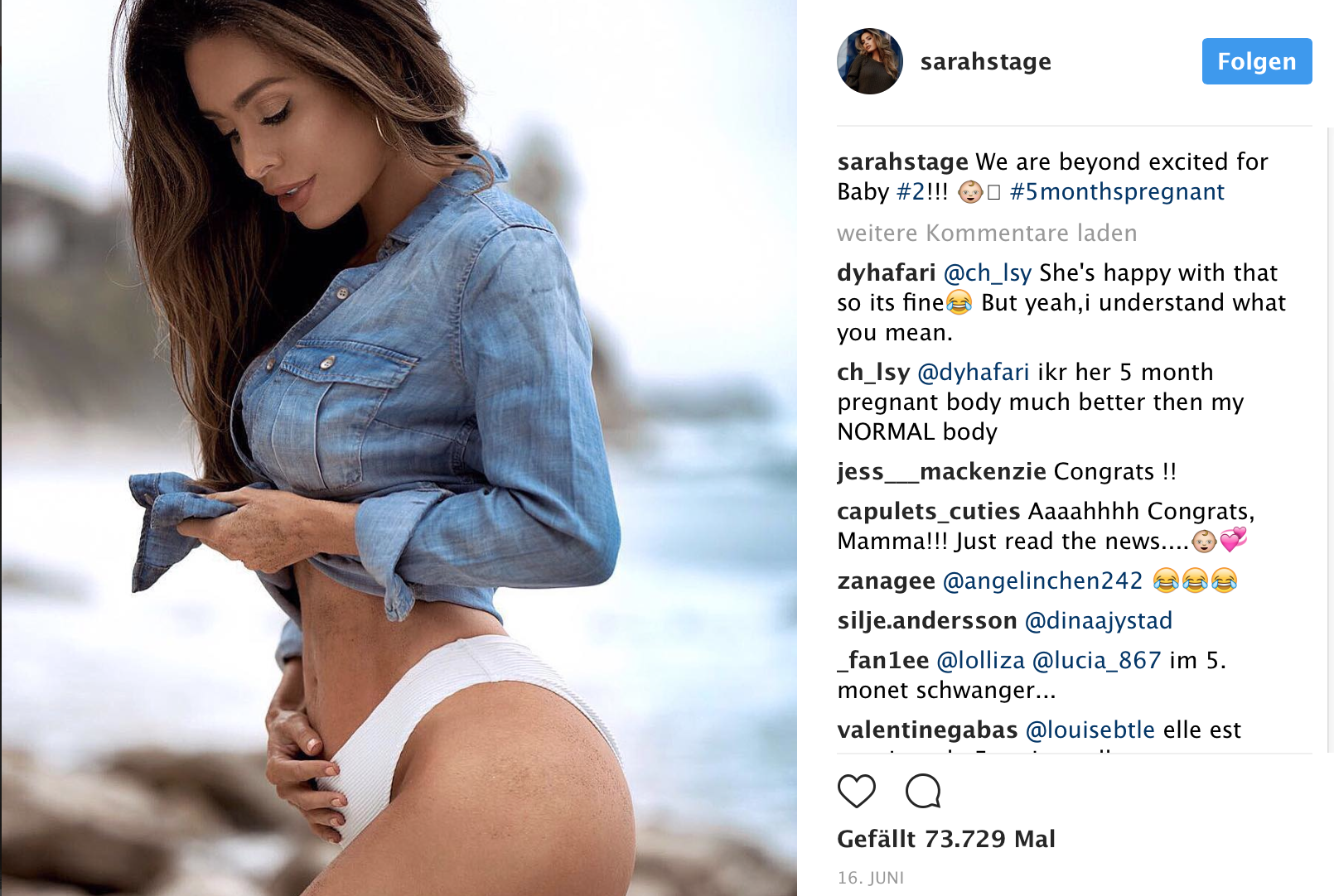Doch für Stage ist das nicht das erste Mal. Bereits während ihrer ersten Schwangerschaft erntete die „Sixpack-Mutter“ sowohl äußerst positive, als auch ziemlich heftige Kritik für ihre mega schlanke Figur und ihren Sixpack-Ansatz. Damals kündigte sie erst im siebten Schwangerschaftsmonat ihre Schwangerschaft mit einem Bild auf Instagram öffentlich an und verriet die Monate zuvor selbst ihren Auftraggebern und Agenturen nichts davon. Weitere Schwangerschaftsbilder folgten, die der Amerikanerin über 1 Millionen Follower auf Instagram bescherten. Auf die Frage, wie sie ihre Modelfigur während der Schwangerschaft beibehalten konnte, erklärt die 32-Jährige, dass sie bereits vor der Schwangerschaft extrem fit war.