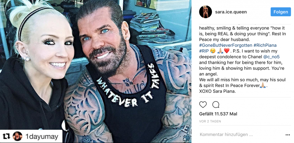 Neben Bradley Martyn und den Machern von „Generation Iron“ war Pianas Ex-Frau, von der sich Rich hatte vor einem Jahr scheiden lassen, eine der ersten die auf ihrem Instagram-Account offiziell den Tod von Rich Piana bestätigte. Bei Instagram schrieb Sara: „Während ich dies schreibe, weine ich, @1dayumay (Rich Pianas Instagram-Name, d.Red.) ist eben gestorben. Ich kann es kaum glauben, mein Herz ist gebrochen.“ Mit den Worten „Ruhe in Frieden, mein Ehemann“ beendete sie den Post. Das Komische dabei: Rich Piana veröffentlichte im November ein Video auf YouTube, in welchem er nicht nur die Trennung von Sara, sondern auch die Annullierung der Ehe bekannt gab. Als Grund nannte Rich damals, dass Sara die Ehe nur dazu benutzt hätte, um in den Besitz der amerikanischen Staatsbürgerschaft zu gelangen. Außerdem hätte sie ihm mehrfach größere Summen an Geld gestohlen. So hätte er nie gedacht, jemals auf eine Heiratsschwindlerin hereinzufallen, bedauerte der Bodybuilder zum damaligen Zeitpunkt. Somit ging die Welt logischerweise davon aus, dass die Ehe offiziell beendet sei.