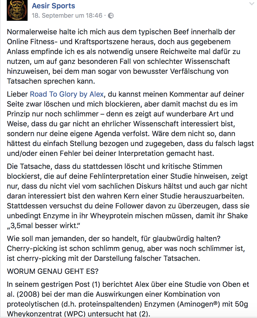Doch der Kommentar währte nicht lange und wurde kurze Zeit später wieder von Alex gelöscht. Daraufhin sah sich der Aesir Sports-CEO gezwungen, einen Beitrag auf der Facebook-Seite des Portals zu veröffentlichen. Darin wird dem Road to Glory-Mitglied unter anderem unterstellt, bewusst Tatsachen zu verfälschen und nur die eigene Agenda zu verfolgen anstatt wirkliches Interesse an der Wissenschaft zu zeigen und für eine falsche Interpretation gerade zu stehen bzw. diese zuzugeben.