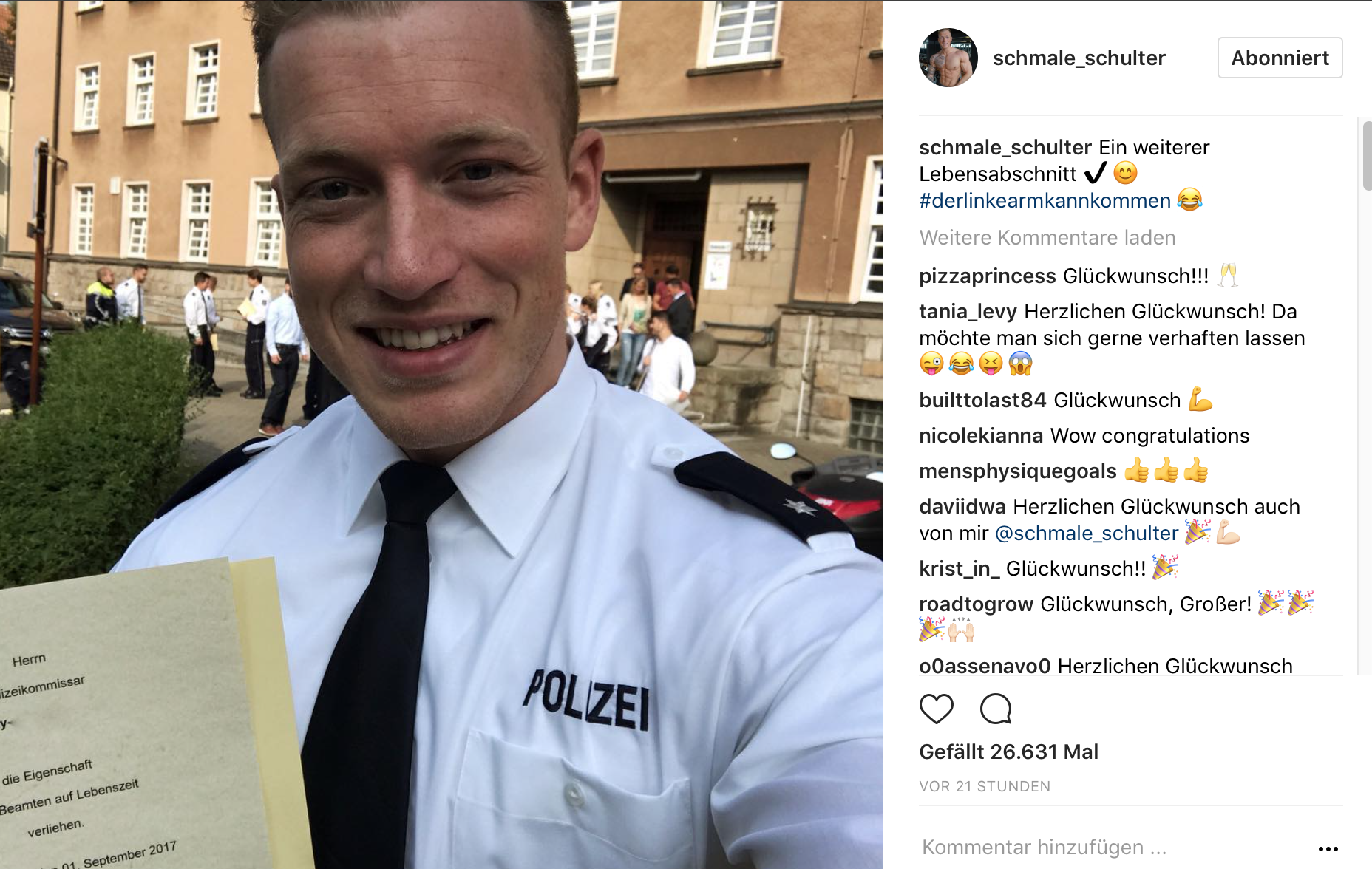 Stolz präsentierte Kay diese Woche seine offizielle Ernennung zum Polizeikommissar und der damit verbundenen Eigenschaft „Beamter auf Lebenszeit“. Damit ist die berufliche Laufbahn des Rocka Nutrition Athleten eigentlich in festen Tüchern. Viele mögen sich fragen, weshalb Schmale Schulter sich nicht nur auf das YouTube Business konzentriert. Doch für Kay war wohl schon immer klar, dass er sich darauf nicht verlassen möchte. Gerade wenn es um eine mögliche Familienplanung geht, sei er froh, Beamter sein zu können und ein festes Einkommen zu haben.