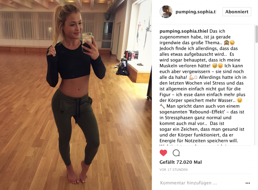 Gerade jemand, der so einen Bekanntheitsgrad hat, wie Sophia Thiel, gerät schnell mal in die Schusslinie, wenn er sich verändert. Viele werfen der Rosenheimerin aktuell vor, sie würde sich gehen lassen und würde den gesunden Lebensstil vernachlässigen. Dadurch sehen viele Sophias Rolle als Fitness Vorbild nicht mehr gerechtfertigt. Schließlich könne man meinen, sie habe sämtliche Muskeln verloren, mit dem Training aufgehört und würde nur noch essen. Dass dem allerdings nicht so ist, betont Thiel jetzt auf ihrem Instagram Account. Sie empfindet die derzeitige Gewichtsdiskussion um sie als „aufgebauscht“. Es stimme nicht, dass sie Muskeln verloren hat. Durch den Stress und durch größere Essensmengen habe sie einfach ein wenig zugelegt. Dadurch habe sie zudem Wasser eingelagert. Für Sophia scheint das also kein Drama zu sein.