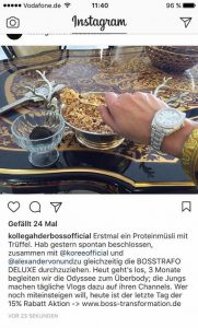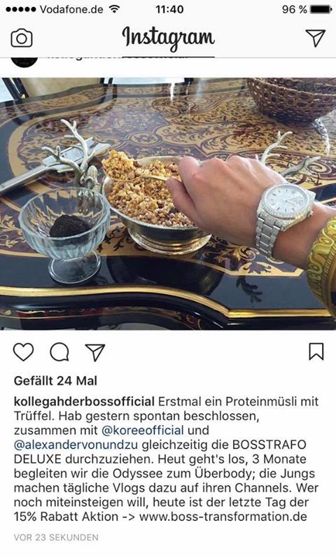 Heute postete der Rapper auf der Plattform Instagram, dass sein Trainingsangebot nun in eine finale Runde ginge. Das optimierte Programm hieße nun “ Bosstransformation Deluxe“, mit nochmehr Möglichkeiten. Zu diesem Anlass hätten sich sogar sein Beatproduzent Korree & Geschäftspartner Alexander von Koenichstheyn dazu angeboten, diese „Verwandlung“ am eigenen Leibe mit durchzuziehen. Festgehalten wird dies auf den Plattformen Facebook & Instagram.
