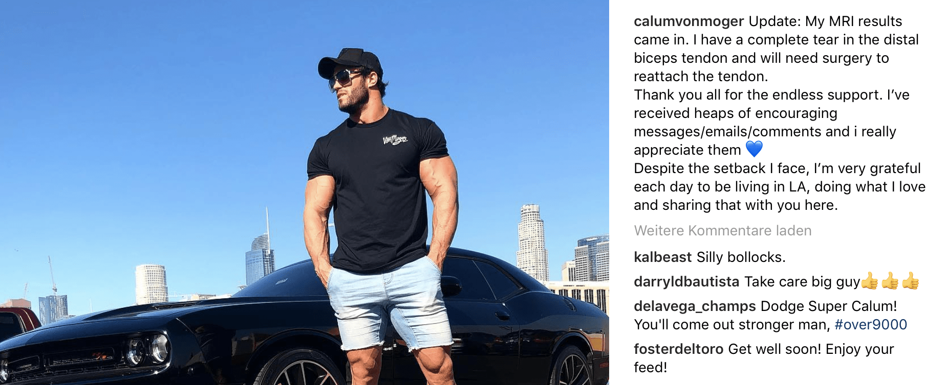 Gestern postete Calum von Moger auf Instagram ein erstes Update nach seiner Verletzung. Calums Post zufolge soll eine MRT Untersuchung ergeben haben, dass er sich seine Bizepssehne angerissen habe. Daher werde er sich in Kürze einer Operation unterziehen müssen, bei der die Sehne wieder wieder korrekt angebracht werden soll, schreibt der in LA lebende Australier weiter. Im gleichen Atemzug wolle er sich jedoch nicht von diesem Rückschlag unterbringen lassen, sondern seinen Fans für die aufmunternden Worte unendlich danken.