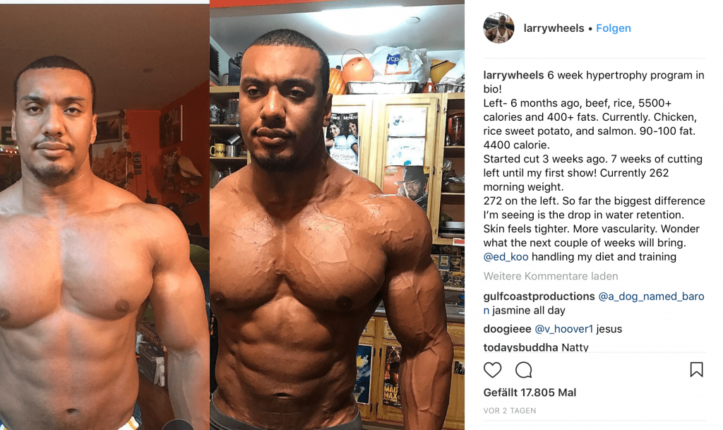 War seine Diät zu Powerlifting Zeiten noch ziemlich „locker“ und alles andere als strikt (in Larrys Fall nahezu jeden Tag Pizza und Donuts), musste Wheels seine Ernährungsgewohnheiten in Vorbereitung für seinen ersten Bodybuilding Wettkampf teilweise drastisch ändern. In einem seiner neuesten Instagram Posts gab der junge Powerlifter nun zum ersten Mal „grobe“ Einblicke in seine Wettkampfdiät. Allerdings ging er dabei nicht direkt auf seinen exakten Ernährungsplan, sondern auf die Gesamtkalorien ein. So habe er bis vor drei Wochen noch ca. 5500 Kalorien und über 400g Fett täglich zu sich genommen, schreibt er. Seit dem Beginn seiner Wettkampfdiät habe sich neben der Kalorienzahl (4400 Kalorien täglich) vor allem sein Fettkonsum auf „nur noch“ 90-100g pro Tag reduziert.
