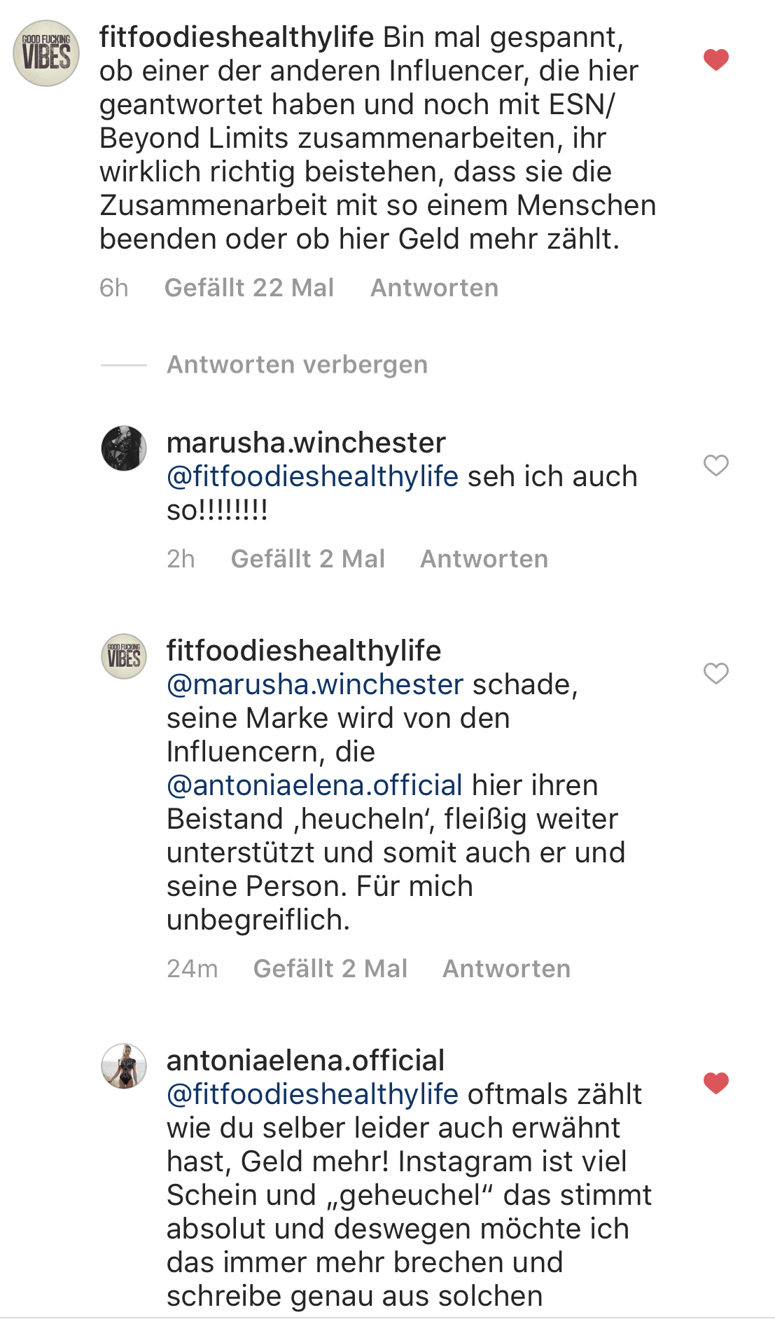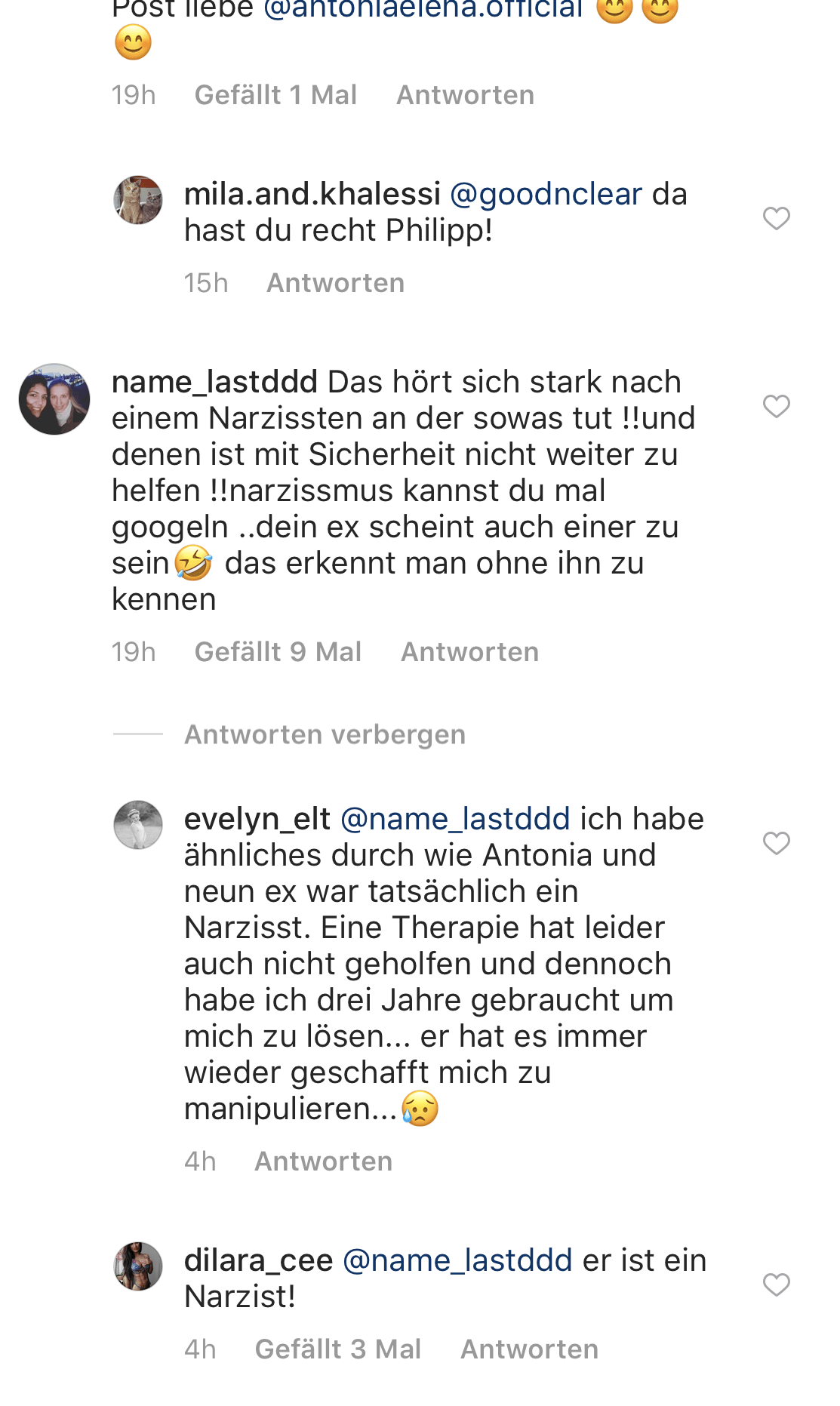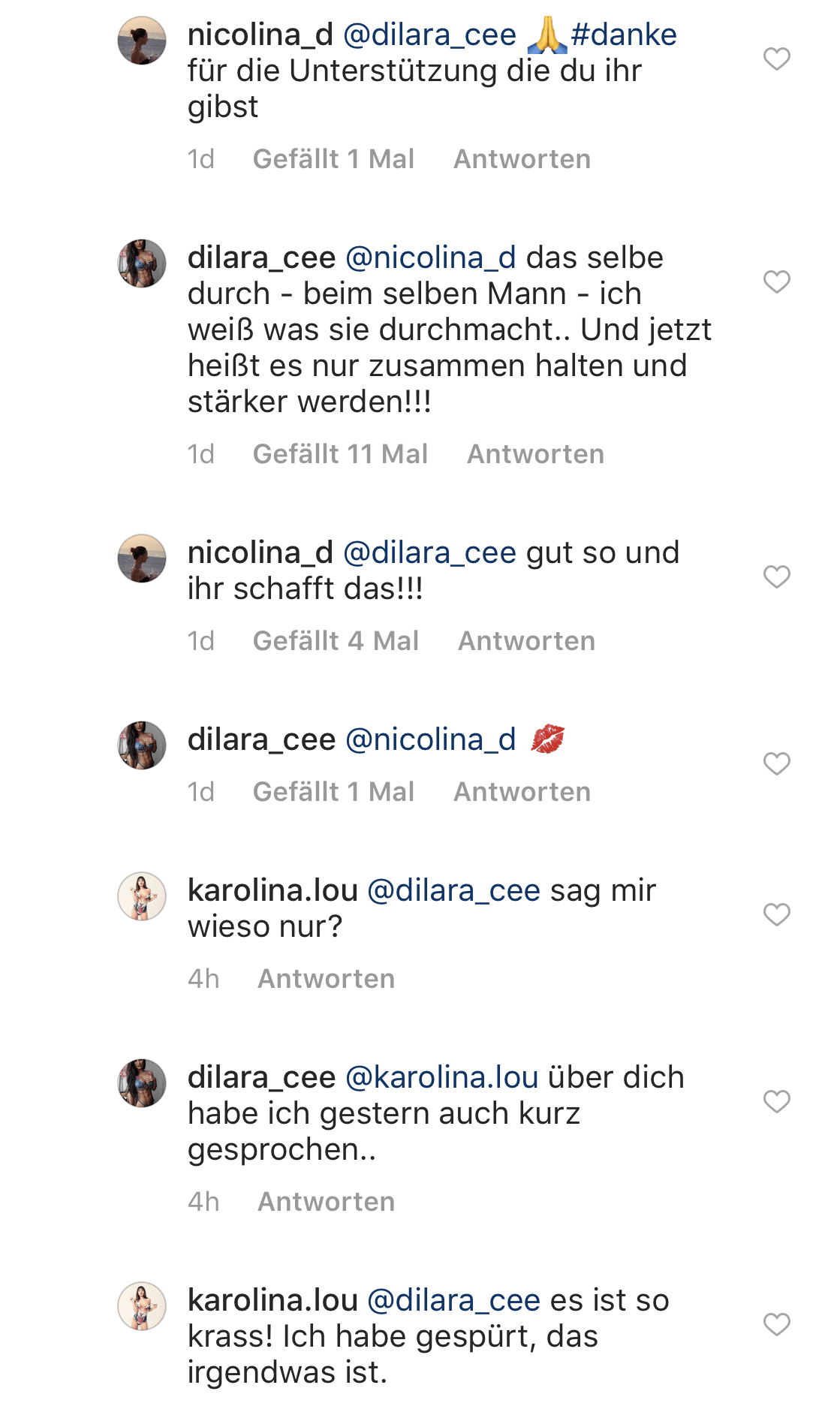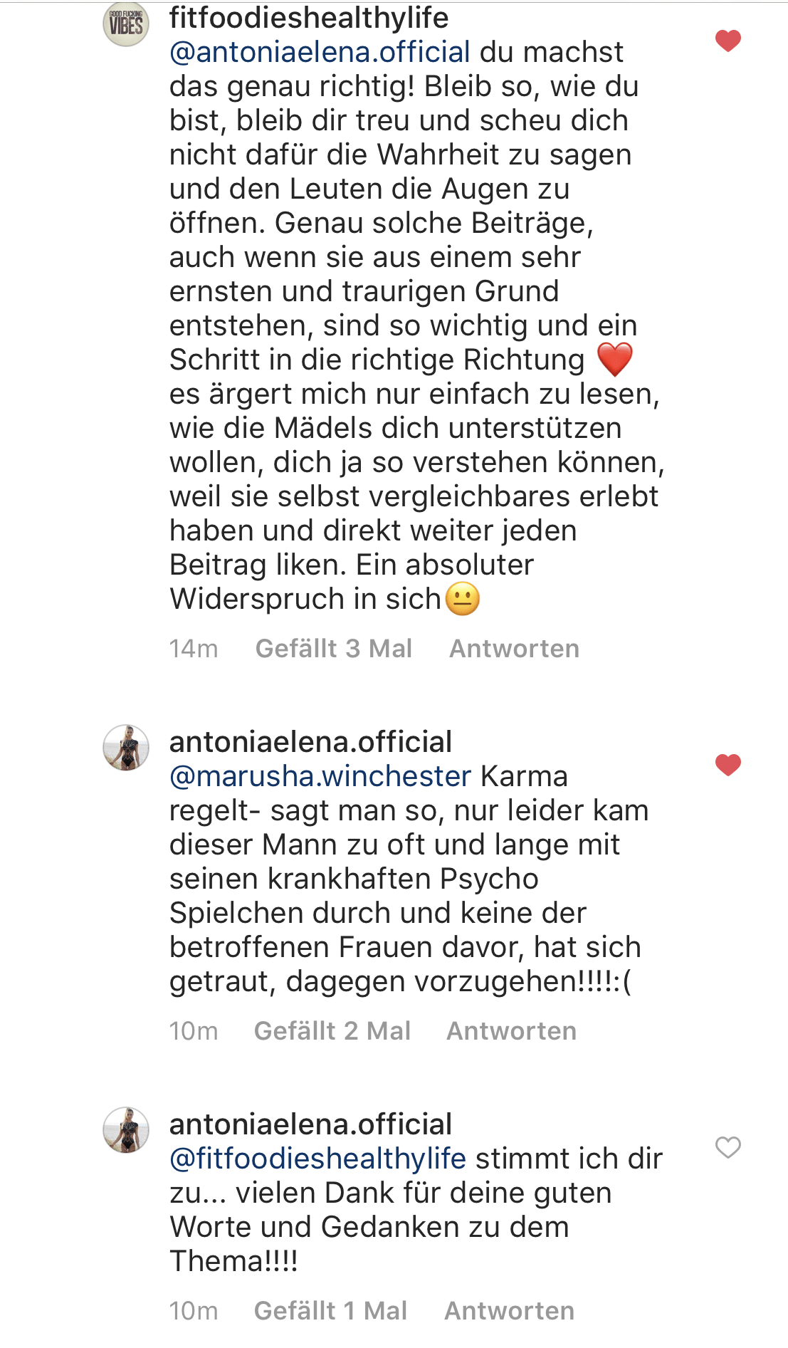 Neben zahlreichem Zuspruch und aufmunternden Worten für Antonia, melden sich nun auch zwei weitere Frauen zu Wort. Auch sie scheinen vom gleichen Mann psychische Gewalt erfahren zu haben. Darunter findet sich überraschend auch die GymQueen Athletin Dilara_Cee. In einem Kommentar berichtet sie von ähnlichen Erfahrungen und bietet Antonia ihren Beistand an. Kurze Zeit später hat sich eine weitere Dame angeschlossen, die wohl ebenfalls ähnliche Erlebnisse durch den gleichen Mann erfahren hat. Keiner der Beteiligten nennt Namen, allerdings widerspricht auch keine den zahlreichen Vermutungen.