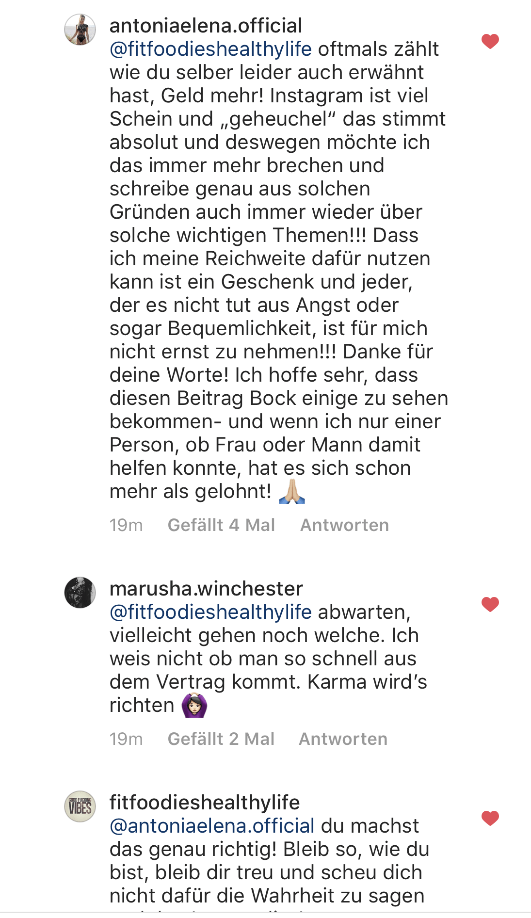 Der Instagram Post von Antonia am vergangenen Freitag dürfte ihre Community in eine Schockstarre versetzt haben. Tatsächlich spricht die hübsche Münchnerin darin das Tabu Thema „Psychische Gewalt“ an und gibt dabei zu selbst zum Opfer geworden zu sein. Anhand einiger Warnsignale möchte Toni für das Thema sensibilisieren und aufzeigen, welche Auswirkungen diese Gewaltform haben kann. Auch wenn Antonia keine Namen nennt und im Text eher eine allgemein gehaltene Sprache verwendet, meinen ihre Fans scheinbar direkt wer und was gemeint sein könnte. Zudem verwendet die Fitness Influencerin am Ende ihres Posts zwei eindeutige Hashtags: „#whyistayed“ (warum ich geblieben bin) und „#metoo“ (auch ich). Letzterer wurde vor allem im letzten Jahr durch die sexuellen Misshandlungen in Hollywood weltweit bekannt.