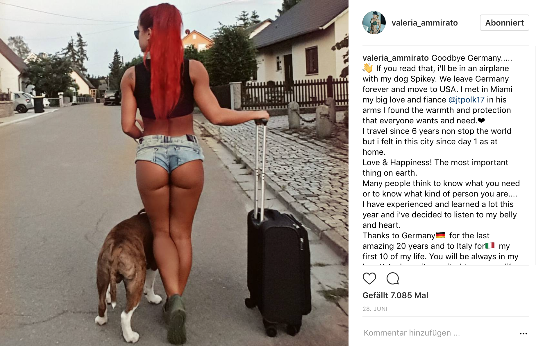 Bereits Ende Juni diesen Jahres hat die Bikini Athletin Deutschland den Rücken gekehrt. Diesmal sollte das allerdings keiner Reise geschuldet sein, sondern der Liebe. Tatsächlich hat Valeria in den USA nämlich einen Partner gefunden, mit dem sie offenbar auch die Zukunft planen will. In Zuge dessen hat sich die IFBB Athletin nach Miami verabschiedet und lebt seither dort den amerikanischen Lifestyle.