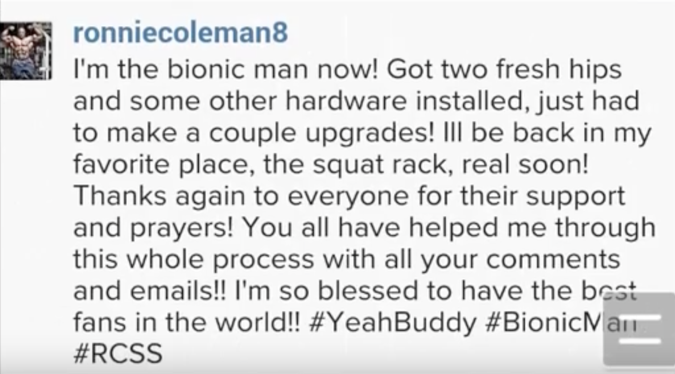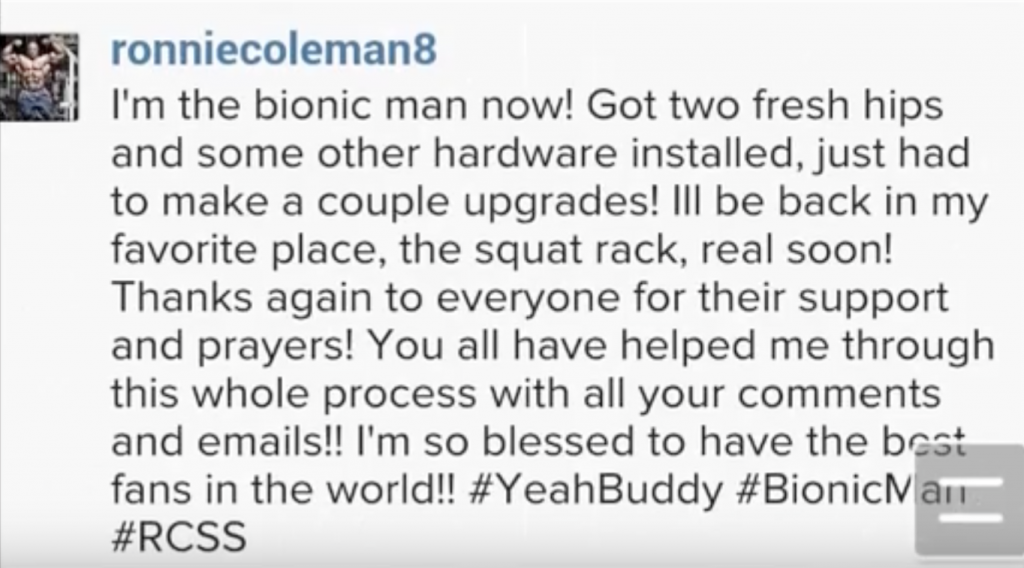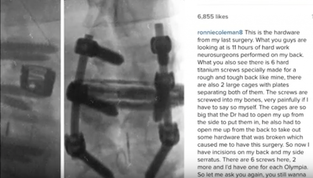 Colemans Aussagen zufolge war diese Art von „Power Bodybuilding“ für ihn absolut entscheidend, um das Maximale an Muskelmasse aufzubauen. Allerdings hatte diese Trainingsphilosophie auch ihren Preis. Seit seinem letzten Wettkampf vor 10 Jahren musste sich der ehemalige Profi-Bodybuilder mehreren, zum Teil richtig schwerwiegenden Operationen unterziehen. So wurde Ronnie bereits mehrfach an verschiedenen Stellen des Wirbelkanals operiert, Wirbelkörper im HWS- und LWS-Bereicht versteift und zwei künstliche Hüftgelenke eingesetzt.