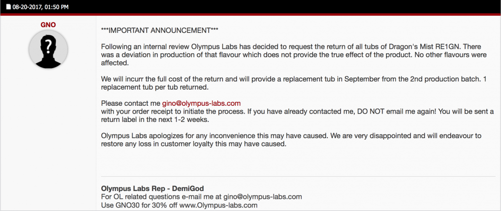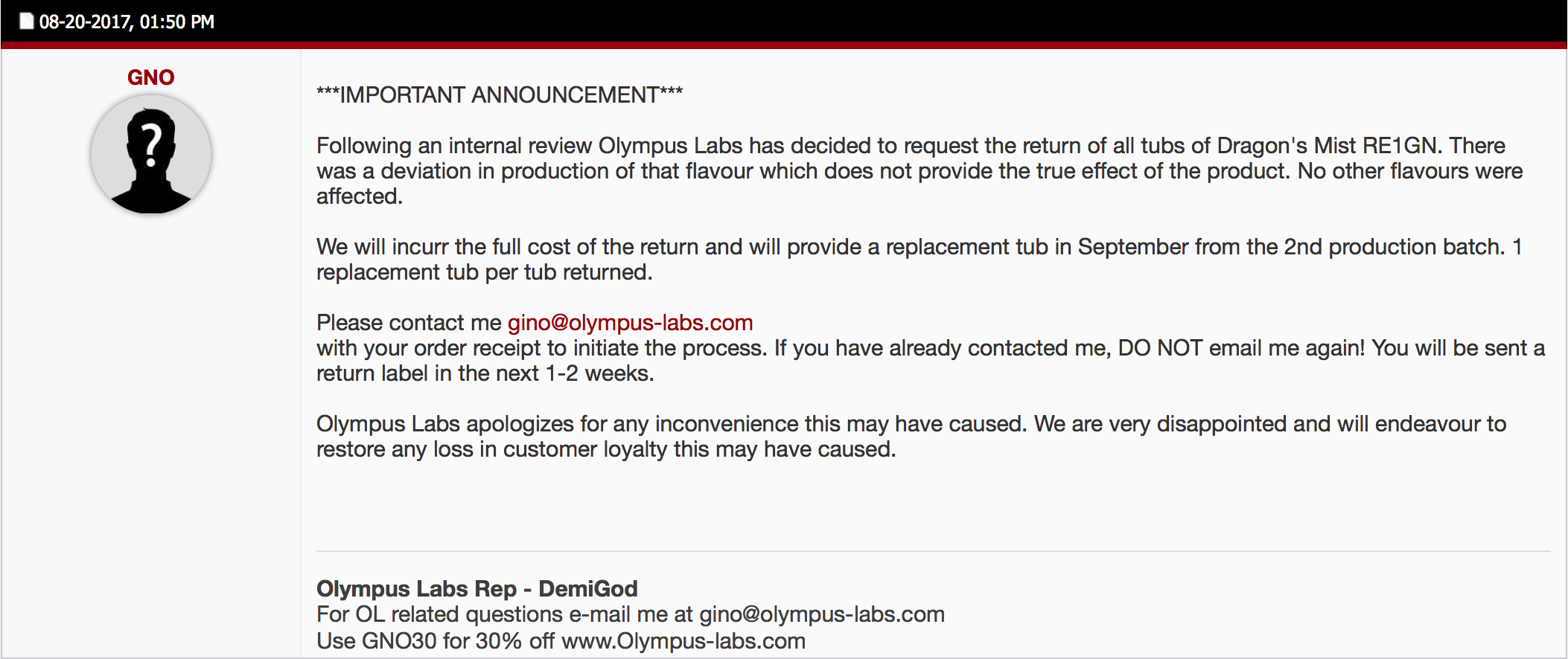 Bereits am 20. August hatte Olympus Labs die Rückruf-Aktion in einem Forumsbeitrag auf www.anabolicminds.com angekündigt. In der Post bot der Hersteller seinen Kunden an, dass Produkt mit der nächsten Lieferung auszutauschen. Da die komplette betroffen Charge über den Supplement-Händler Suppz.com vertrieben wurde, forderte Olympus Labs diesen zeitgleich auf, all diejenigen Kunden via Email zu kontaktieren, die den „Re1gn“ in der Geschmacksrichtung „Dragon’s Mist“ geordert hatten. Bereits vor der Email-Rückrufaktion hatte Suppz.com einigen seiner Kunden, die sich über die Wirkung des Booster beschwert hatten, den Kaufpreis zurückerstattet oder gegen andere Geschmacksrichtung des Boosters auszutauschen. Laut Suppz.com sollen sich die Rücksendungen und Beschwerden bis dato noch im Rahmen halten, allerdings seien bereits mehrere Dutzend eingegangen.