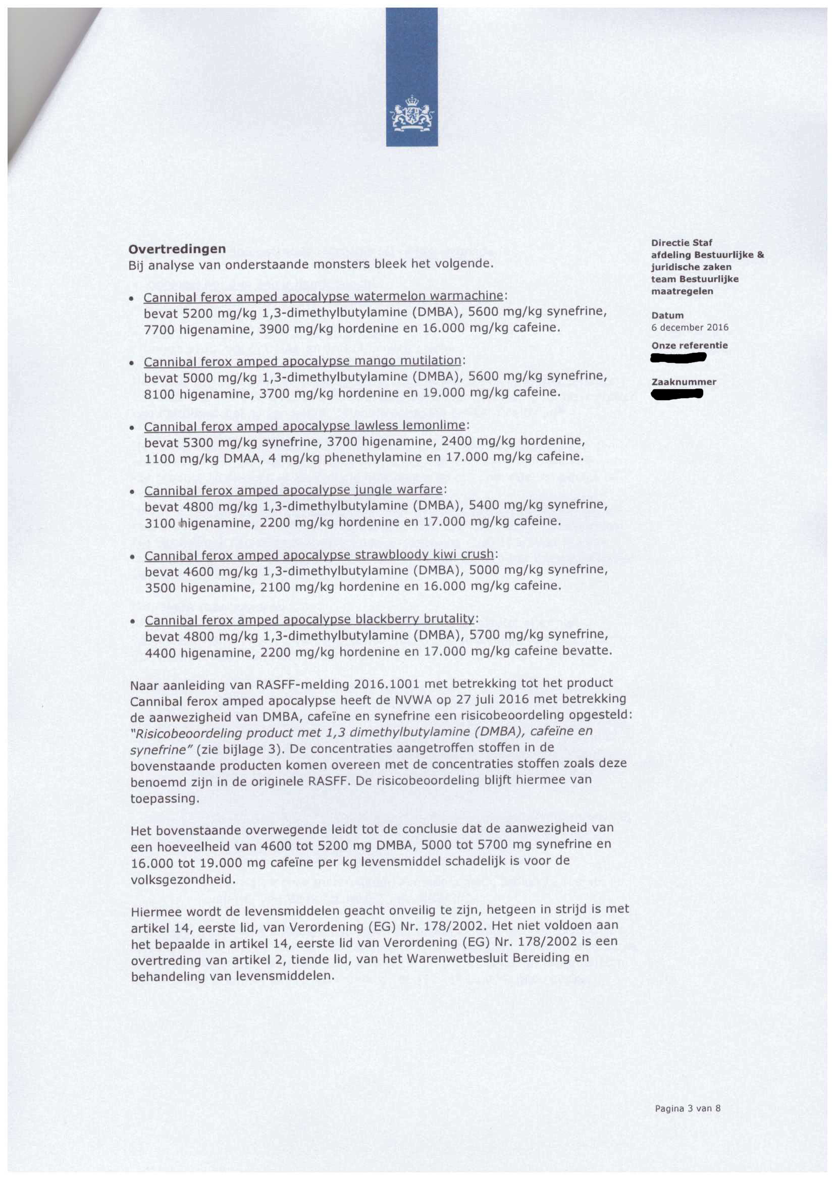 Aufgrund der offensichtlichen Fehldeklarierung des Cannibal Riot, wurde nun noch ein weiterer Hardcore Booster von Chaos & Pain unter die Lupe genommen. Die Rede ist vom allseits bekannten Cannibal Ferox. Diesen gibt es in 2 unterschiedlichen Versionen: Cannibal Ferox Amped und Cannibal Ferox Amped Apocalypse. Beide wurden von der Niederländischen Lebensmittelbehörde NVWA auf ihre Inhaltsstoffe geprüft. Hierbei hat man sich sogar die Mühe gemacht, sämtliche Geschmacksrichtungen zu testen!
