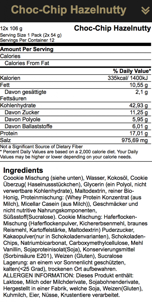Anders als die meisten Protein Cookie Hersteller, hat Madness Nutrition nicht einen Keks pro Packung, sondern zwei. Dabei verzichtet die Marke auf das eher minderwertige Palmfett und verwendet stattdessen Kokosöl. Der Zuckergehalt soll außerdem eher niedrig gehalten sein und vorwiegend vom enthaltenen Bio-Honig stammen.