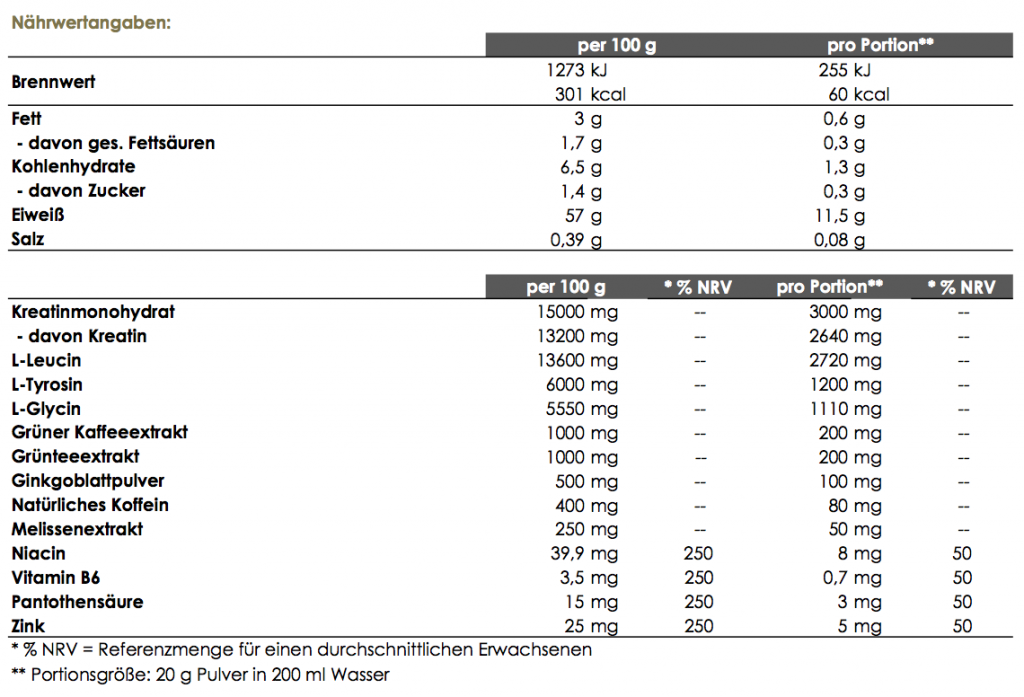 Schließlich bekommt ihr mit einer Portion des Shakes eine Kombination aus Molkeneiweißisolat, ausgewählten Aminosäuren, Kreatin, Pflanzenstoffen und Koffein. Zusätzlich liefert die Rezeptur L-Leucine, L-Tyrosine für die geistige Leistungsfähigkeit, sowie eine extra Portion Zink und Vitamin B6. Für den zusätzlichen Kick hat Weider außerdem noch Green Coffee Extrakt, Grünteeextrakt und Ginkoblattpulver mit in die Rezeptur gegeben.