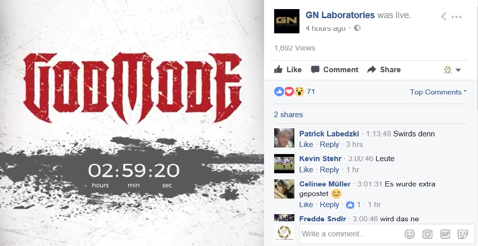 Dieser Tag war nun gestern. Und wie von GN nicht anders zu erwarten, setzte der Hersteller in der Tat neue Maßstäbe. Um 17h ging auf der Facebook-Seite des Herstellers ein LIVE-Countdown online. Nach Ablauf des 3-stündigen Countdowns folgte dann die Auflösung in Form eines Trailers, der verrückter und abgedrehter nicht sein hätte können. Darin zu sehen ist „Hardgainer“ Kevin, der nach einer Dosis des neuen Boosters „GODMODE“ komplett am Rad dreht. (Bewegte) Bilder sagen bekanntlich mehr als tausend Worte, deswegen schaut euch den unten angefügten Trailer am besten selbst an.