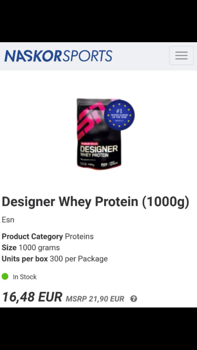 Nehmen wir das ESN Designer Whey Protein als Beispiel. In Deutschland und Europa erfolgt der Einkauf über den Großhändler, NaskorSports. Die in Holland ansässige Firma ist für Händler die einzige Möglichkeit an die Produkte zu kommen – Alternativen gibt es keine. Dort kostet der 1kg Beutel für Händler im Einkauf 16,48 EUR. Als Verkaufspreis gibt der holländische Großhändler seinen Händlern 21,90 EUR vor.