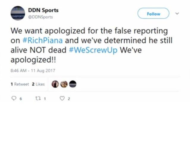 So sollen dem Internetportal Informationen aus Rich Pianas Familienkreis vorgelegen haben, laut denen Rich bereits am Donnerstag Abend um 22:30h in einem Krankenhaus in Florida gestorben sei. Außerdem soll dem Portal mitgeteilt worden sein, dass Rich bereits von Ärzten für hirntot erklärt worden sei, nachdem er ins künstliche Koma versetzt wurde. Des Weiteren berichtete die Plattform, dass ihnen Informationen des Notrufeingangs am Montag vorliegen würden. Demzufolge soll der Notruf nach einer möglichen Überdosis Pianas von seinem Haus aus eingegangen sein. Als die Rettungskräfte vor Ort eintrafen, war Piana bereits nicht mehr ansprechbar und wurde sofort in ein Nahe gelegenes Krankenhaus, so die „Verkünder“ der News weiter.