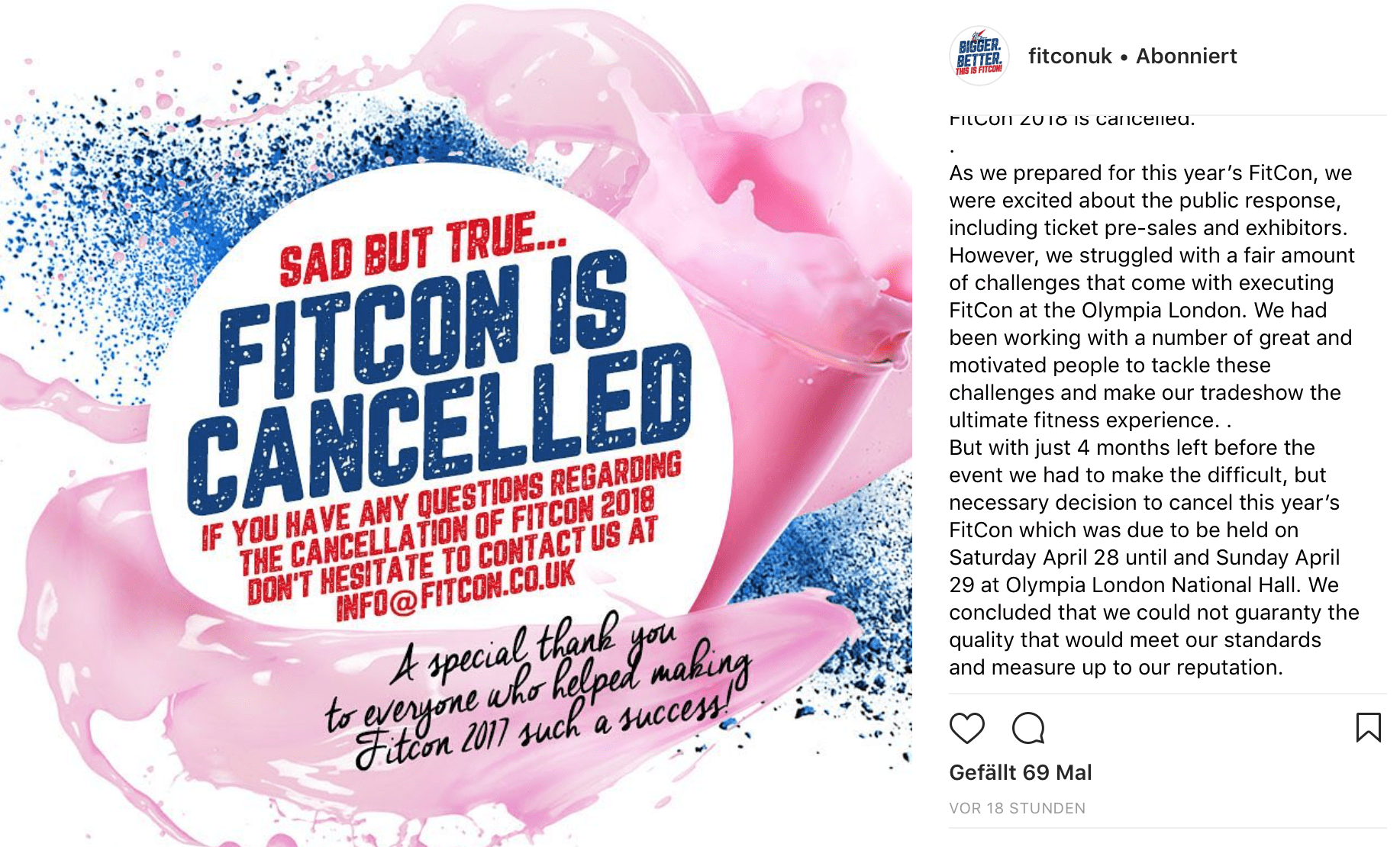 Der Post der Fitness Messe FitCon von gestern Abend wird sicherlich einige Menschen ziemlich enttäuscht haben. Völlig unerwartet hat der Veranstalter die Expo abgesagt, die Ende April in London stattfinden sollte. Grund dafür waren offenbar einige Hindernisse, die sich bis dato nicht klären konnten. Demnach gehen die Planer der FitCon wohl davon aus, dass sich das auch in den nächsten vier Monaten nicht bereinigen lässt.