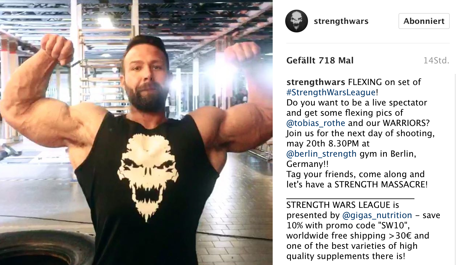 In ihrem neuesten Instagram-Post gaben die Macher von Strength Wars nun den nächsten Austragungsort der Strength Wars League bekannt. So werden die nächsten Battles am Samstag, den 20. Mai ab 20:30h im Berlin Strength Gym in Berlin abgedreht. Neben dem „Hardgainer“ Tobias Rothe werden sich an besagtem Tag noch viele weitere „Warriors“ messen und fleißig auf „Punkte-Jagd“ gehen. Damit das Ganze in einem „Strength Massacre“ endet, sind alle sportbegeisterten Fans des Formats herzlichst zum Dreh eingeladen.