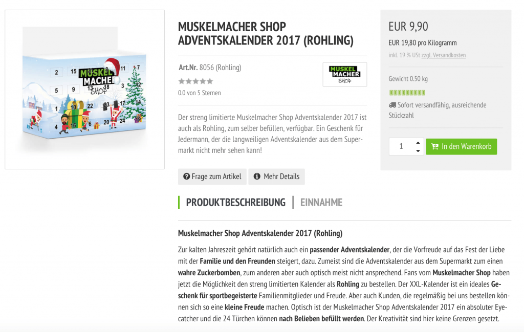 Last but not least hätten wir dann noch das Exemplar des Muskelmacher Shops. Da es sich hierbei nicht um eine eigenständige Supplementmarke, sondern einen Online Shop, handelt, dürften sich hinter den Türchen des Kalenders Produkte vieler unterschiedlicher Marken befinden. Wer sich also nicht nur auf einen Hersteller fixieren will, dürfte hiermit ganz gut bedient sein!